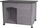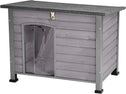 Large Dog House Features: Cabin dog wooden house's sealed protective coating, raised floor with 4 waterproof foot pads, and weatherproof asphalt roof,PVC door curtain avoid the rain and water,Great provide comfortable and dry room for dogs.Open or lock roof help your pets bathed in the sun, the removable floor as well as convenient for owners to feed and clean.