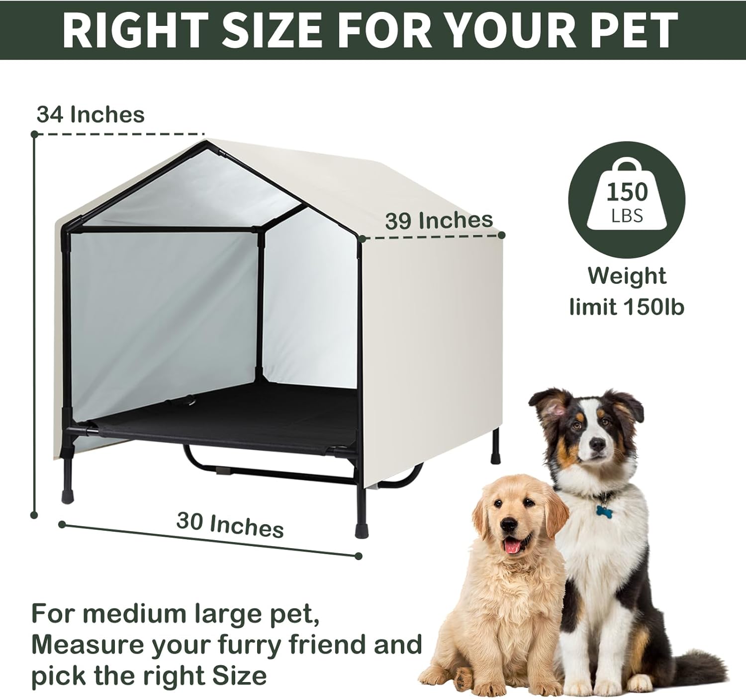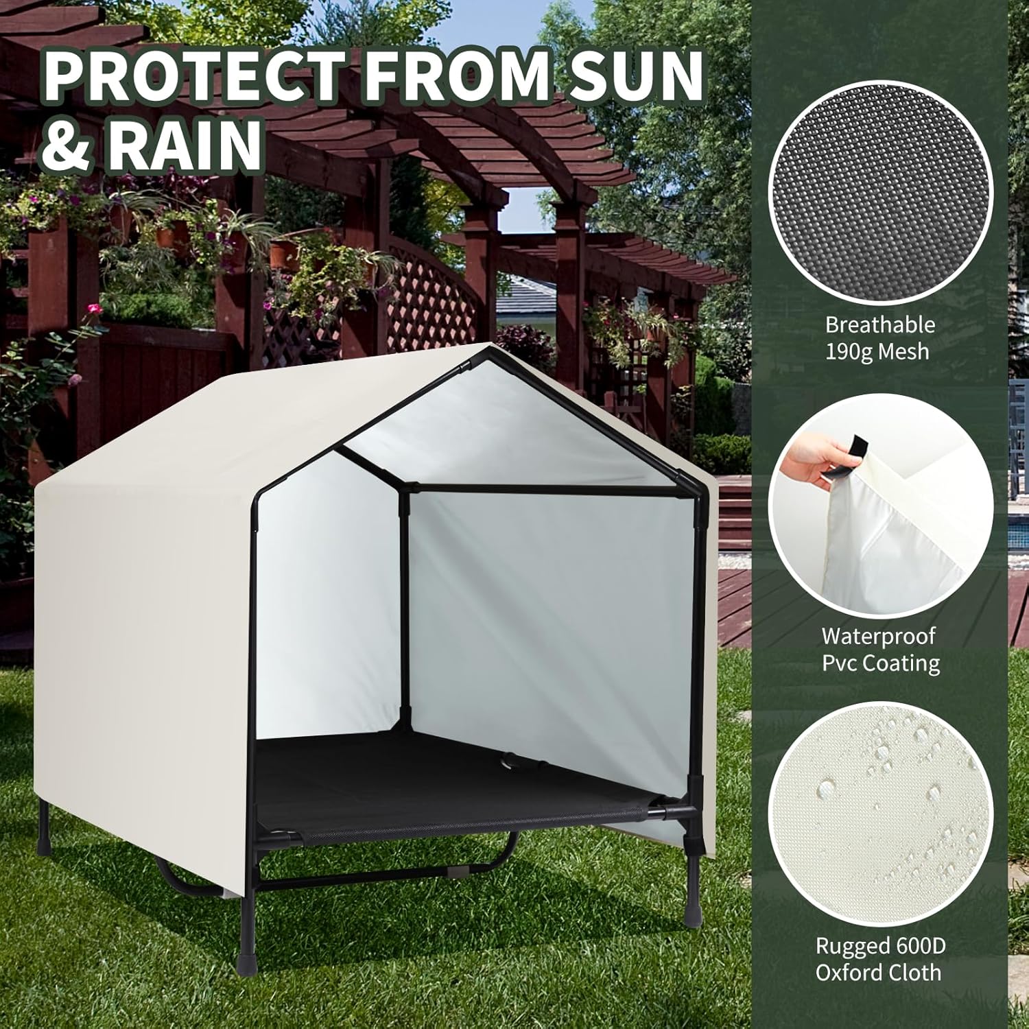 - VENTILATED ELEVATED RAISED OUTDOOR DOG BED HOUSE - The elevated dog house shelter keeps your pet off the hot or cold, damp ground, reducing the strain on their joints and muscles. The breathable rip-stop 2X1 mesh ensuring your pet stays cool in the summer while dry and protected from the elements in the winter