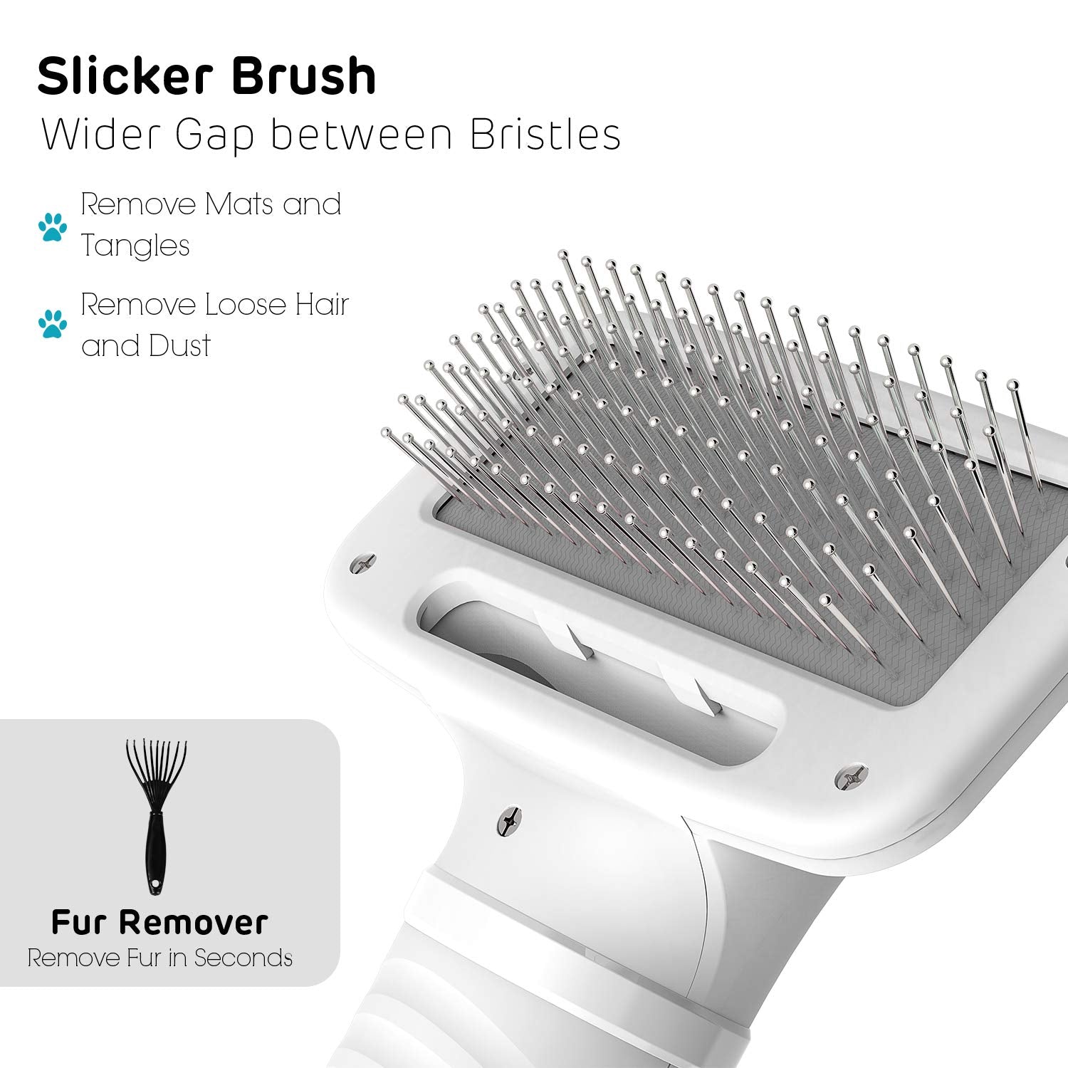 - 【Wide Gap Brush】Better for pets with lots of fur, long and curly coats or undercoats. Specifically designed for small and medium-sized dogs/cats. The slicker brush is comprised of stainless steel soft pins, featuring a protected tip with a slight angle – allowing you to reach deeply to your pet’s undercoat without scratching the skin.