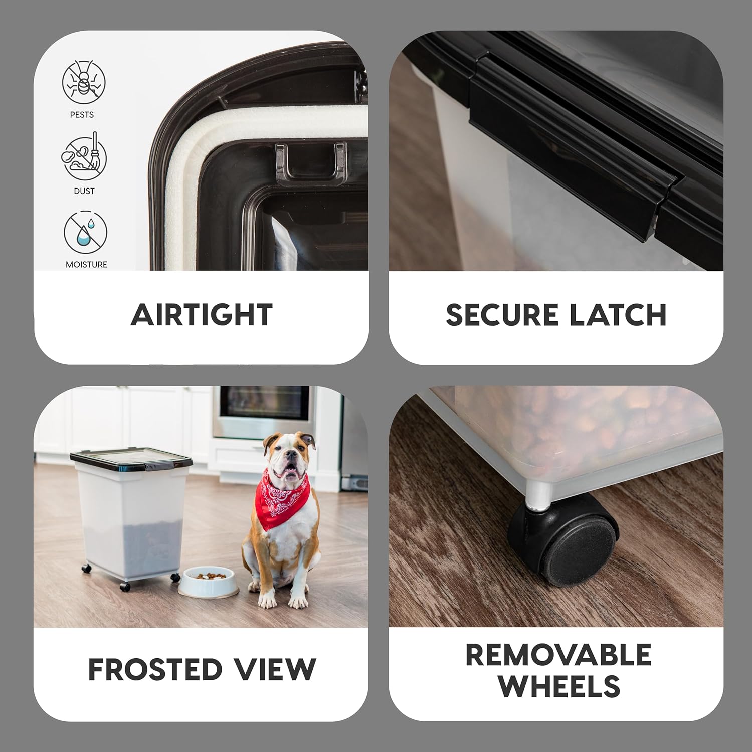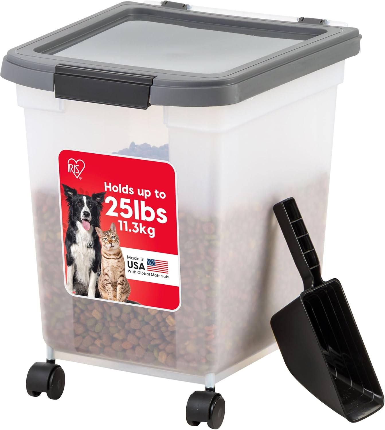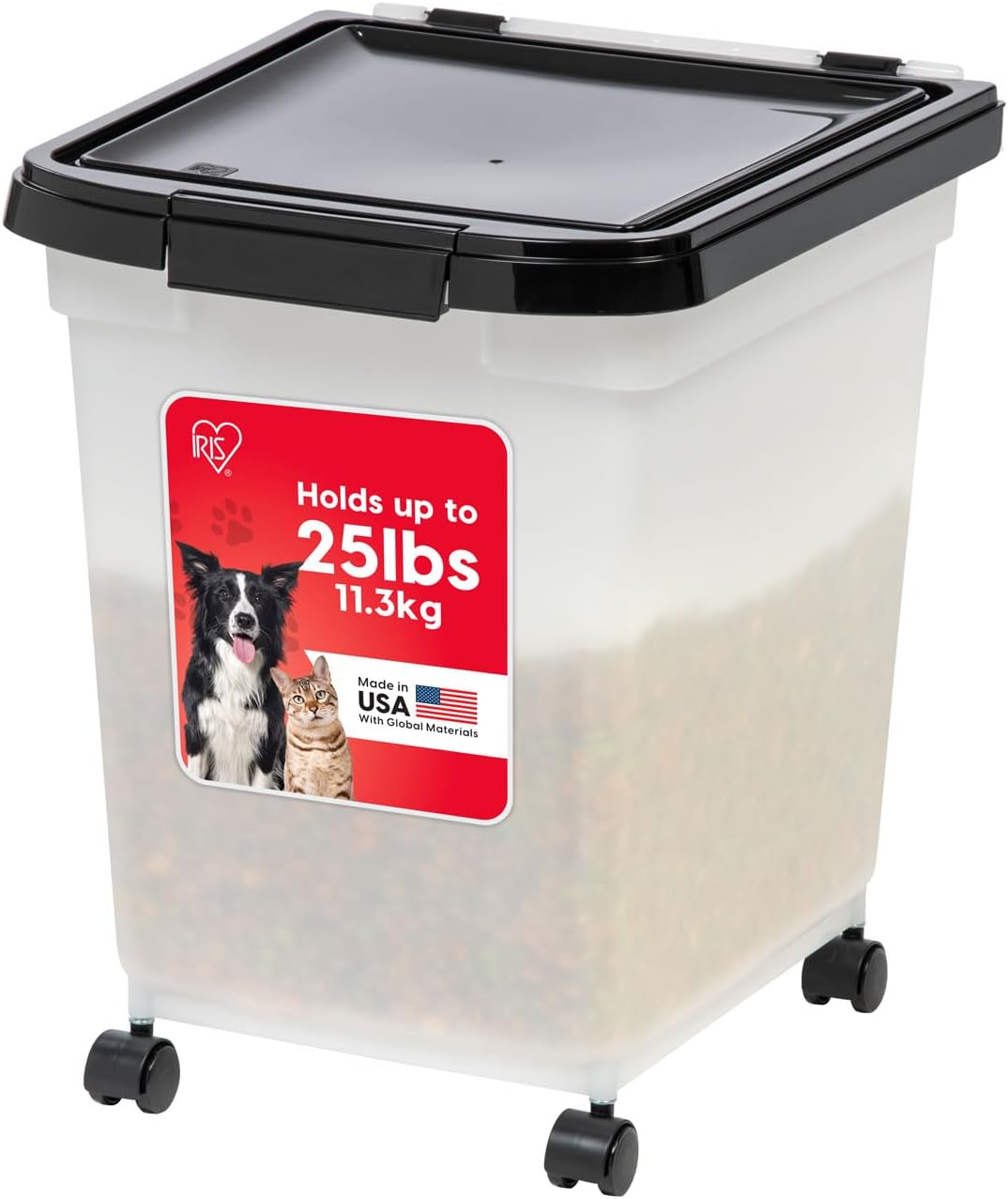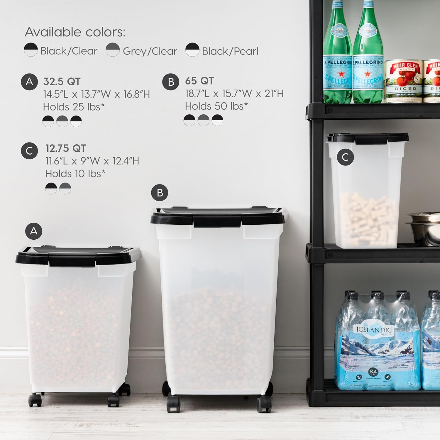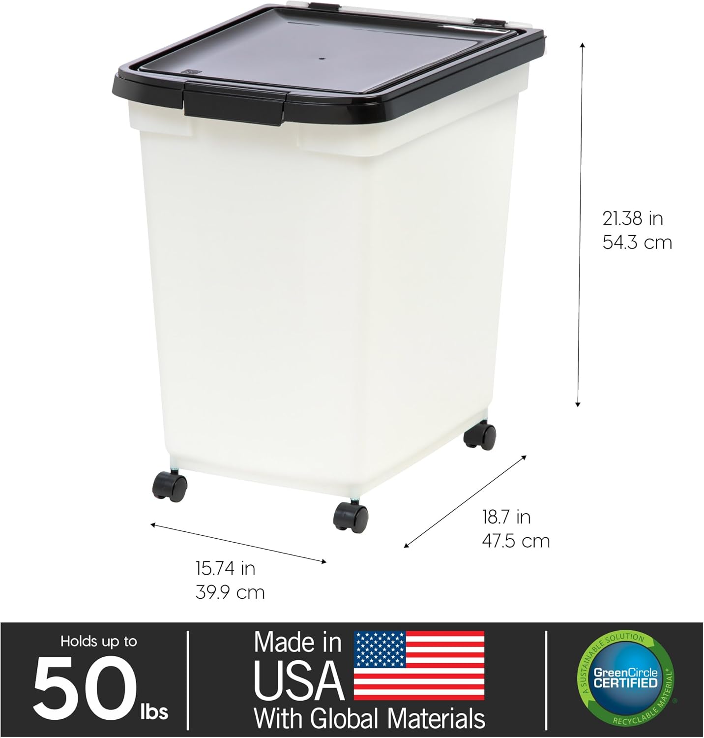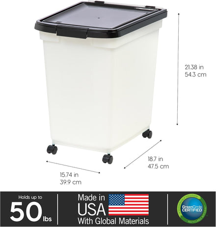 Meet the IRIS airtight pet food container with casters designed with your pet in mind. This 65 quart sealed storage container with lid is perfect for storing dog food, cat food, or any other pet food you wish to store. The plastic airtight food storage container features a foam seal and snap lock latches to keep contents fresh. Designed as pet food bins, These BPA free rolling storage bins offer many other uses as well, such as leash and toy storage, pellet storage, grain storage, bird seed storage, cat litter storage, or even as a Charcoal container. This Iris airtight pet food container with casters is versatile and functional, and the casters allow for easy mobility in any area of the house. Made in the USA.