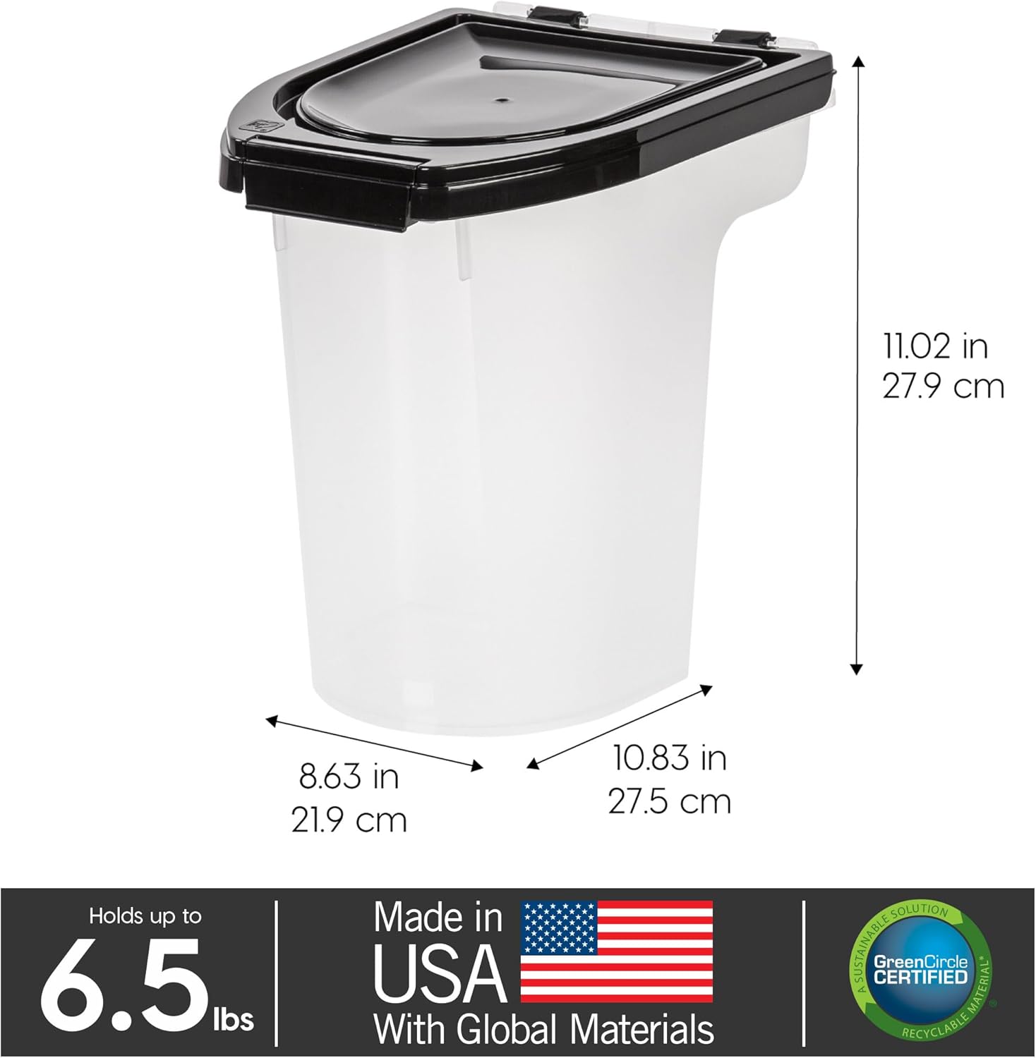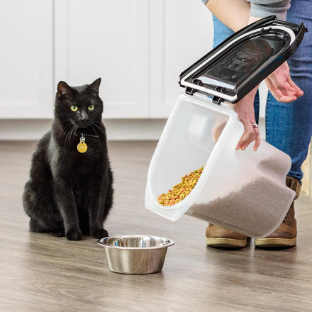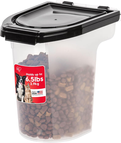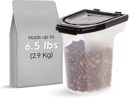 - FOOD FOR ALL: For your cats, dogs, birds, and more. Store your cute family member's dry foods into sealable and portable pet food container. Holds 6.5 Lbs dog food, 5 Lbs cat food, 10 Lbs of bird seed, and 11.5 Lbs cat litter.