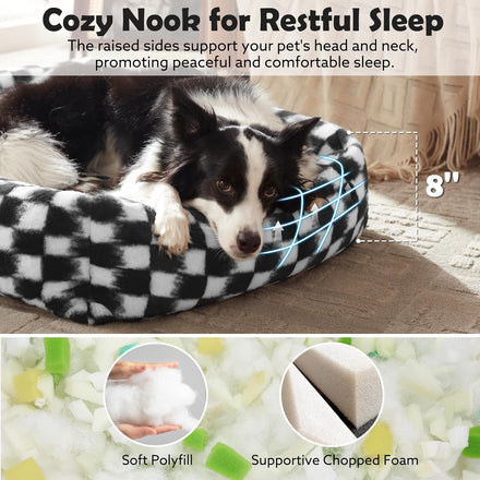 - COMFORT AS PRIORITY: The raised sides of this dog bed medium size dog create a secure, cozy nook for your pet's head and neck, promoting peaceful and comfortable sleep and gentle on the pet's nose and paw. The bottom and sides stuffed with 2:1 ratio chopped foam and polyfill with strong supports to bony and joint areas, pressure relief, relieve joint pain.
