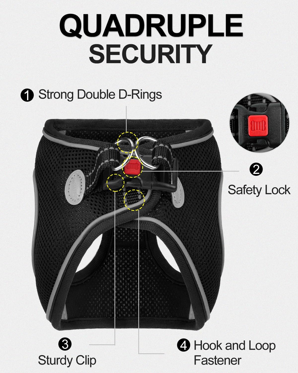 The harness has an extra red safety locking feature for double protection for walking safety, great for active dogs