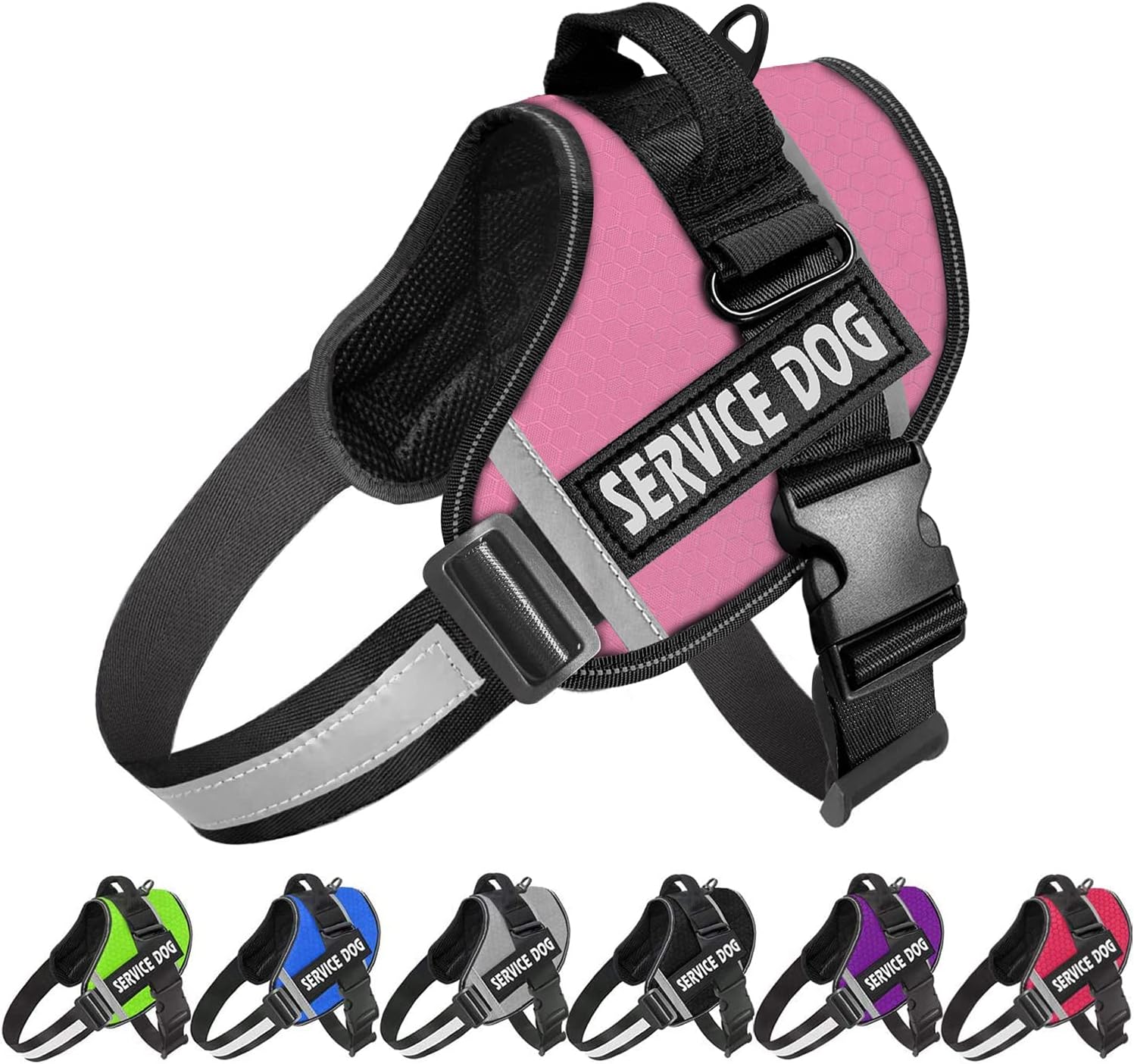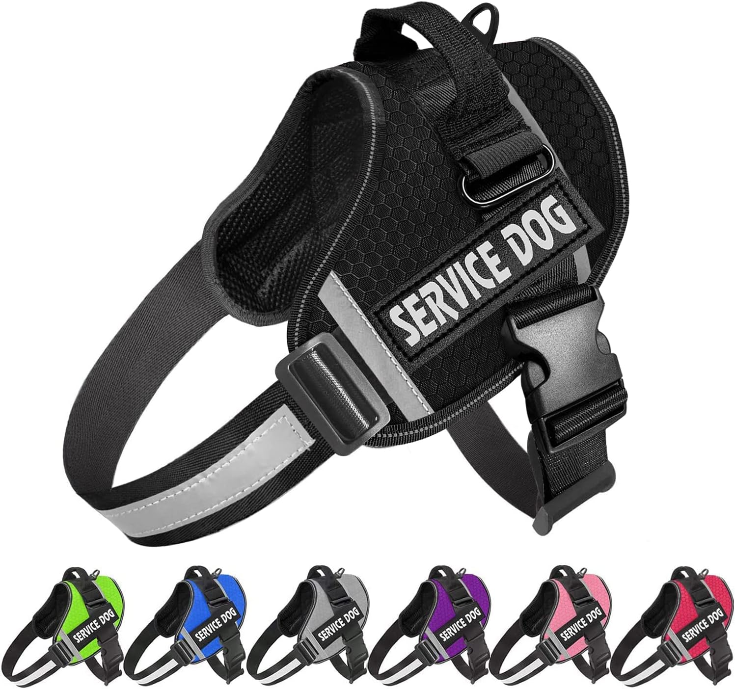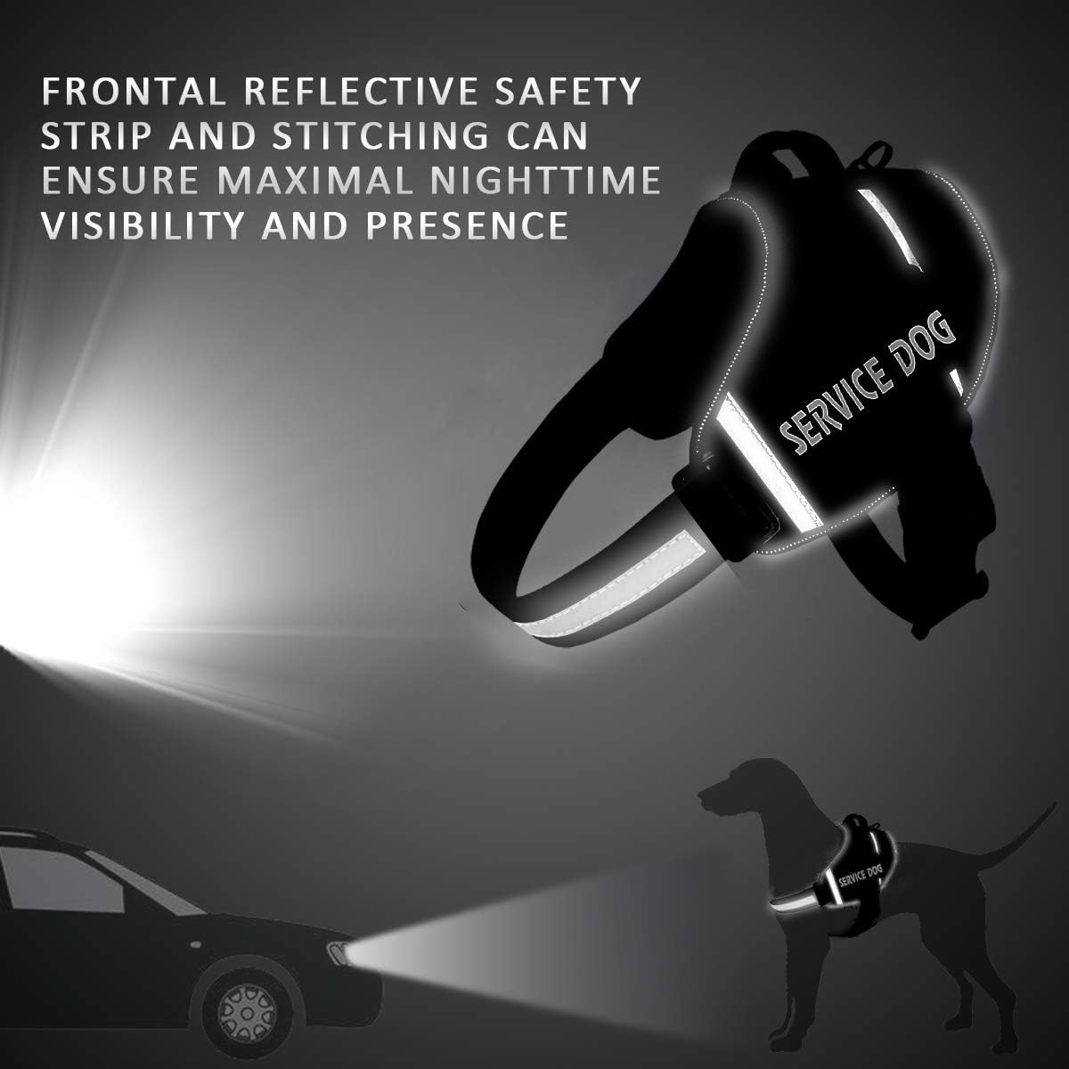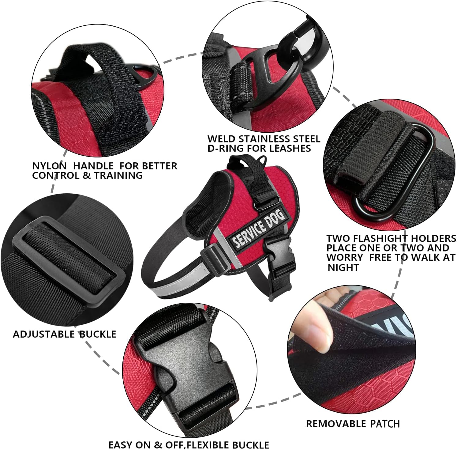 - 【Adjustable Chest Strap & Easy to Use】The service dog vest have a adjustable chest strap with one strong release buckle.The fit of this pet harness can be completely customized for your pet using the slide adjusters at the chest and neck.Hassle Free Overhead Harness is easy to put on and off with its fast-release buckles. Slide the harness over your dog's head,buckle it up,adjust the straps, and here you go! Grab the top handle for additional control. No worries about slipping out or choking.