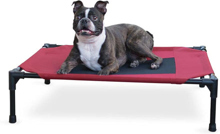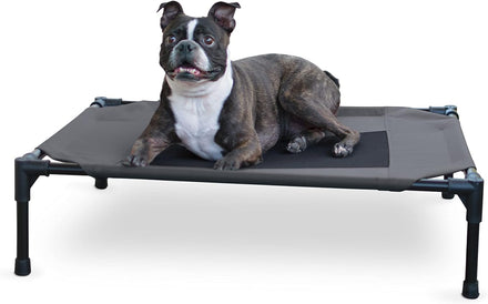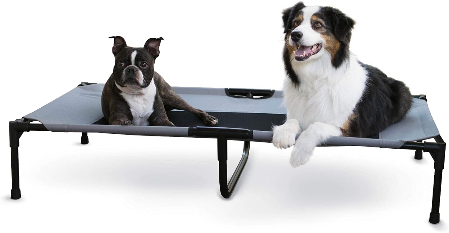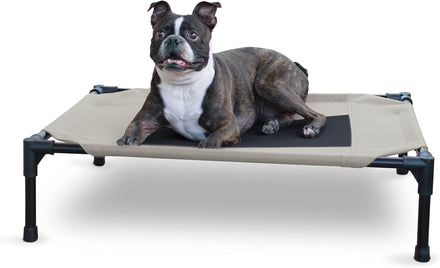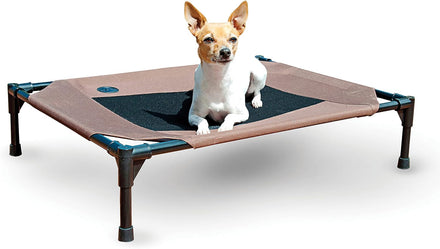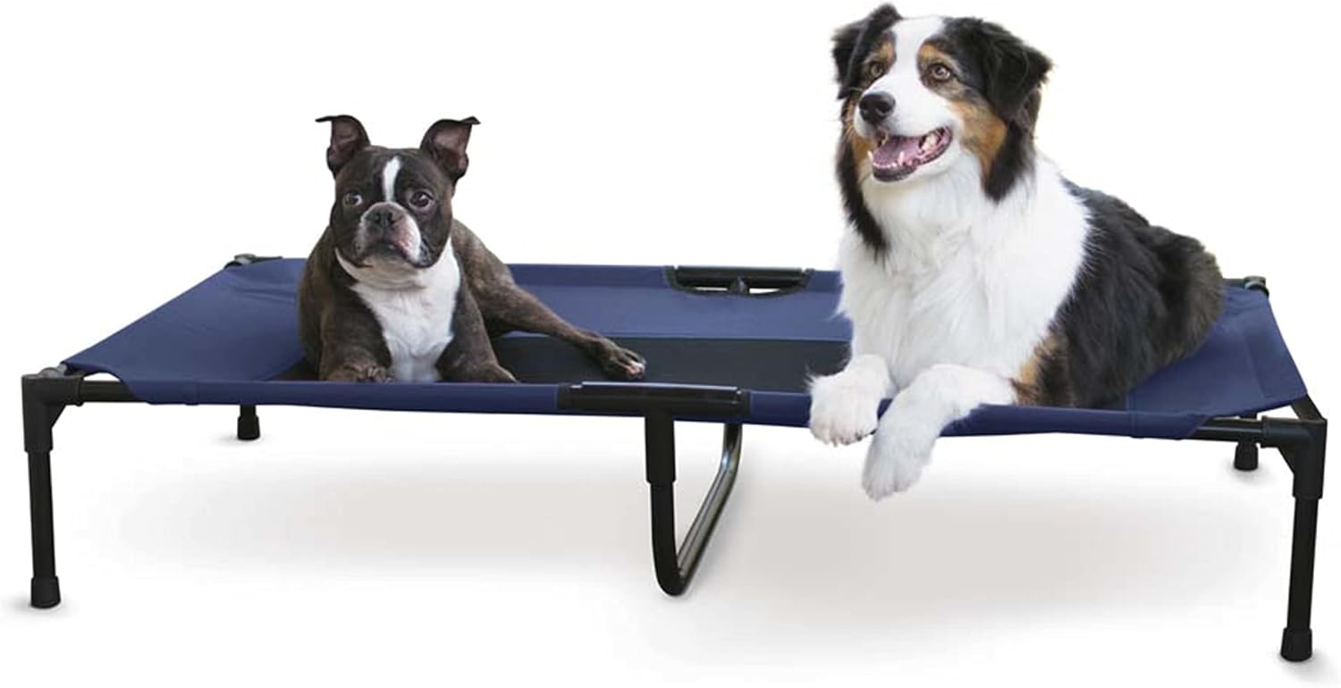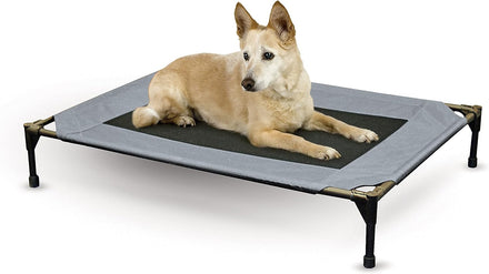 The K&H Pet Products Pet Cot raised dog bed keeps your dog elevated and off the ground allowing air to flow around your pet to keep them cool. The easy to assemble elevated pet bed requires no tools! Can be disassembled and taken anywhere. Our raised dog bed is great for camping, hiking, picnics, or anywhere at home inside or out. Made with water-resistant, heavy denier fabric and a breathable mesh center that repels moisture. The cover is removable and washable or can be hosed off outdoors. Slip-resistant rubber feet help protect floor surfaces. The K&H Pet Cot is durable and can hold up to 200 pounds; the X-Large & Jumbo sizes can hold up to 300 pounds. Indoor or outside use. Available in multiple sizes and colors for any size dog and cats too: Small dogs/cats 17" x 22", Medium dogs 25" x 32", Large dogs 30" x 42", and Extra-Large dogs 32" x 50". Jumbo XXL dogs 56" X 38".