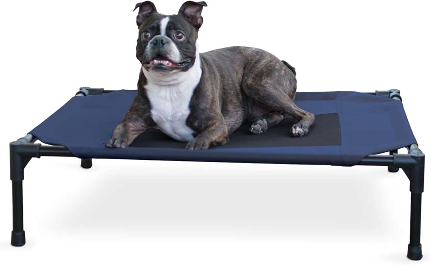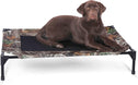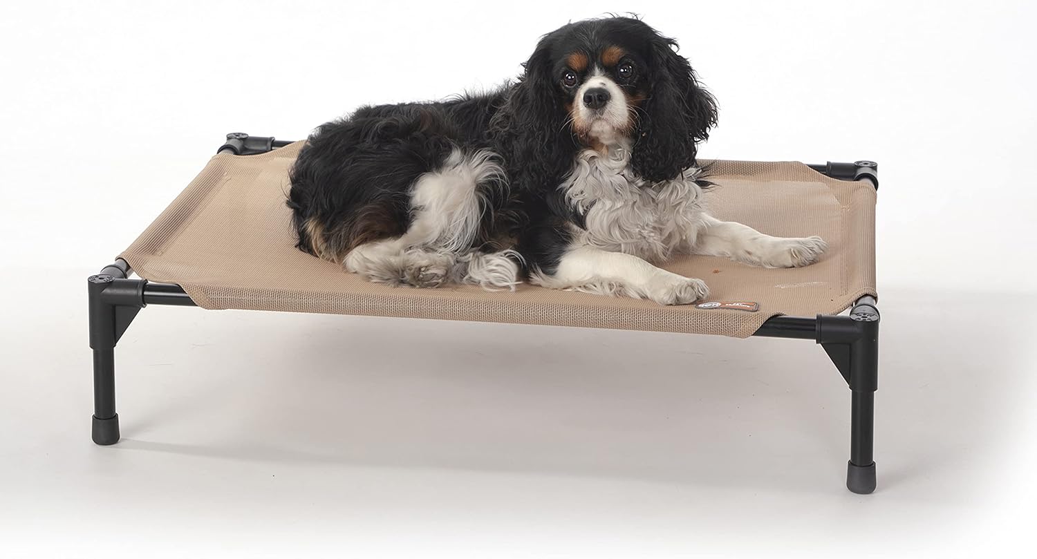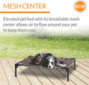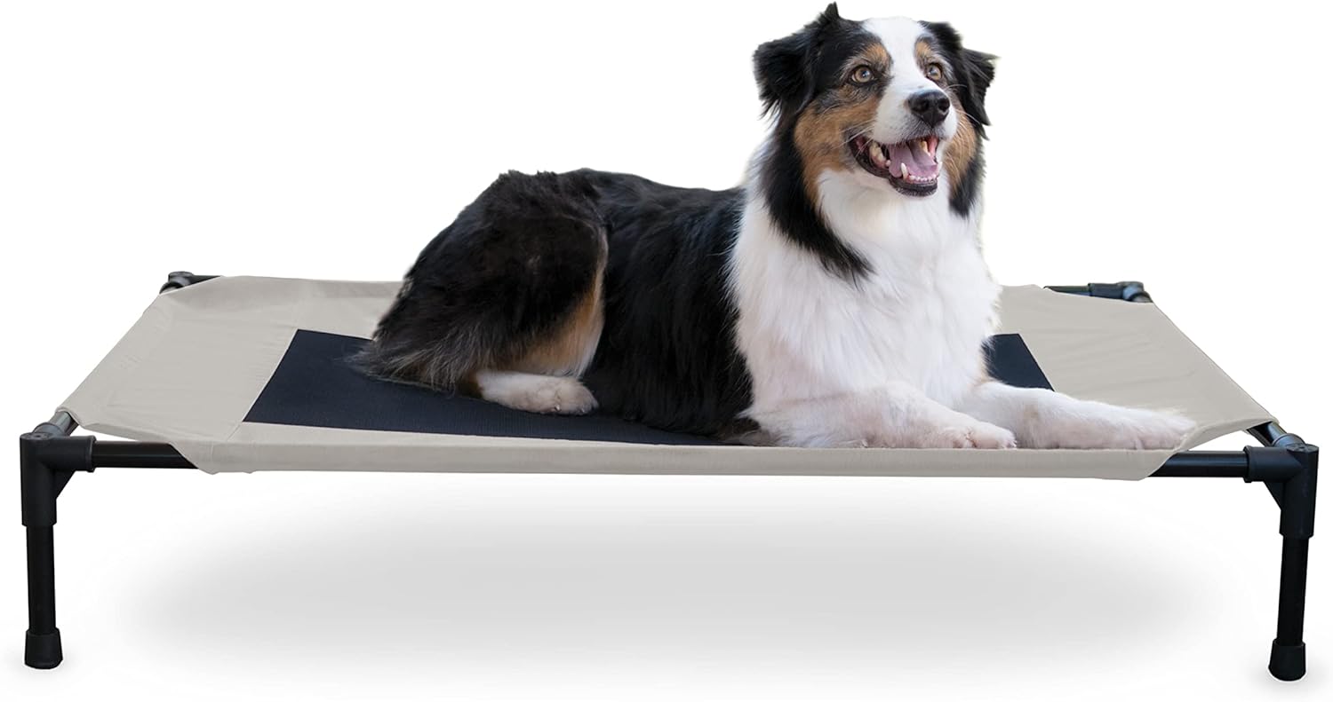 The K&H Pet Products Pet Cot raised dog bed keeps your dog elevated and off the ground allowing air to flow around your pet to keep them cool. The easy to assemble elevated pet bed requires no tools! Can be disassembled and taken anywhere. Our raised dog bed is great for camping, hiking, picnics, or anywhere at home inside or out. Made with water-resistant, heavy denier fabric and a breathable mesh center that repels moisture. The cover is removable and washable or can be hosed off outdoors. Slip-resistant rubber feet help protect floor surfaces. The K&H Pet Cot is durable and can hold up to 200 pounds; the X-Large & Jumbo sizes can hold up to 300 pounds. Indoor or outside use. Available in multiple sizes and colors for any size dog and cats too: Small dogs/cats 17" x 22", Medium dogs 25" x 32", Large dogs 30" x 42", and Extra-Large dogs 32" x 50". Jumbo XXL dogs 56" X 38".