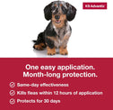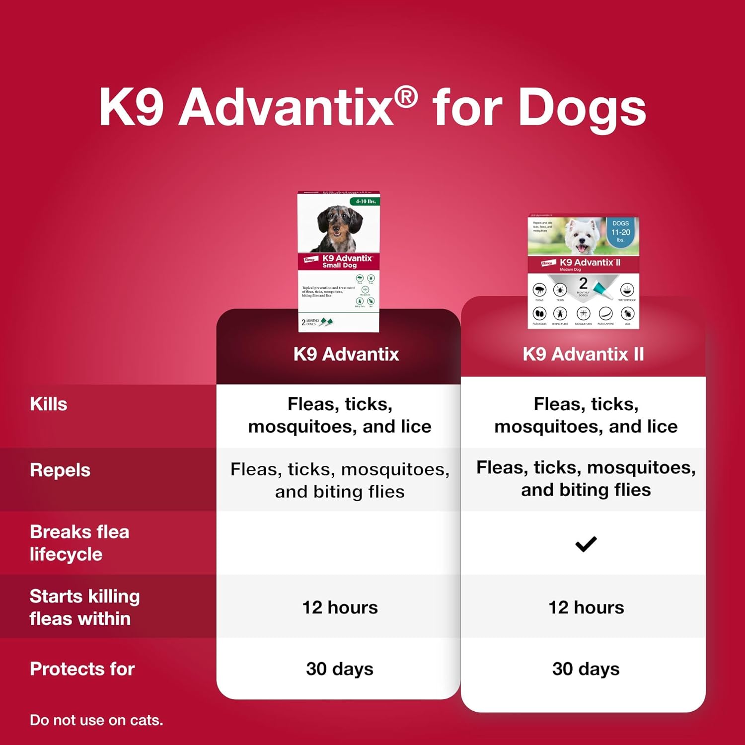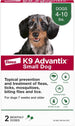 K9 Advantix kills and repels fleas, ticks, mosquitoes, biting flies, and lice. Simpler than a flea collar and hard-to-swallow pills, this topical formula works within 12 hours of initial application to stop existing flea infestations on dogs and prevent new ones by killing adult fleas on contact before they lay new eggs or bite your dog. K9 Advantix offers fast relief at an excellent value, so you and your dog can get back to the things you love most. Your dog should be at least 7 weeks old and weigh 4-10 lbs. to use K9 Advantix Small Dog. Use as directed by label. Do not use on cats.