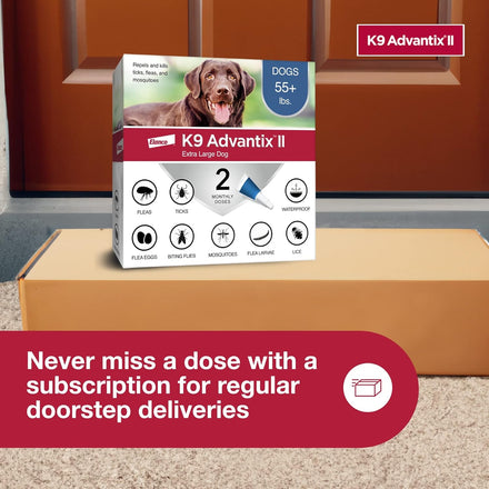 K9 Advantix II Extra Large Dog is the veterinarian-recommended formula that helps defend your dog against five pests: fleas, ticks, mosquitoes, biting flies and lice. And unlike other treatments, K9 Advantix II kills and repels fleas, ticks and mosquitoes. K9 Advantix II topical treatment gets straight to work killing fleas on dogs within 12 hours of initial application. This formula stops existing flea infestations and prevents new ones by killing adult fleas on contact so they can’t lay eggs and they don’t have to bite your dog to die. Fleas, ticks, mosquitoes and other pests not only cause discomfort; they may also transmit disease. Monthly use of K9 Advantix II is important to protect your dog against fleas that may cause transmission of tapeworms. This formula also kills fleas which may cause Flea Allergy Dermatitis and flea bite anemia. That’s why K9 Advantix II Extra Large Dog topical, spot-on formula makes application simple - going on in seconds. It's easier than a flea collar and there are no hard-to-swallow pills. You’ll also love that K9 Advantix II is fragrance-free and waterproof after 24 hours of application. Check the product label for information on application and potential side effects. K9 Advantix II pest protection is effective on both indoor and outdoor dogs. Your dog should be at least 7 weeks old and weigh over 55 lbs. to use K9 Advantix II Extra Large Dog. For the ultimate convenience in care, K9 Advantix II is available over the counter – no prescription needed. And, you can stock up with 2-dose, 4-dose and 6-dose packs so you never miss a monthly treatment. Once K9 Advantix II is applied, your dog is ready to get right back to big-pup cuddles and racing around the park. K9 Advantix II Extra Large Dog is a trademark of Elanco or its affiliates.
