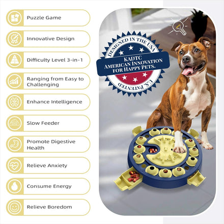 - [American Brand, U.S. Patent] [Advanced 3-Level Puzzle Toy] KADTC is a proud American pet brand with an innovative U.S.-patented design. This advanced puzzle toy combines 3 difficulty levels into one engaging game board, from easy to expert, letting you tailor the challenge to your dog's cognitive development. It's perfect for first-time puzzle solvers and smart pups who crave mental stimulation, adapting as they learn for endless interactive play. Surprise your beloved dog with the ultimate brain game – a playful gift that keeps them happy, engaged, and mentally sharp!