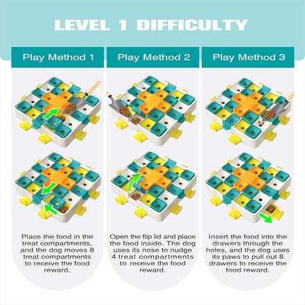 - [Instructions for Difficulty Level 1] Place food in the four flip-open treat boxes. Dogs can use their paws or noses to flip open the lids and get food rewards. Add food to the drawer treat boxes; dogs pull it open with their paws to access the food. Add food to the eight sliding-lid treat boxes, and dogs can use their paws or noses to move and eat.