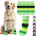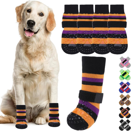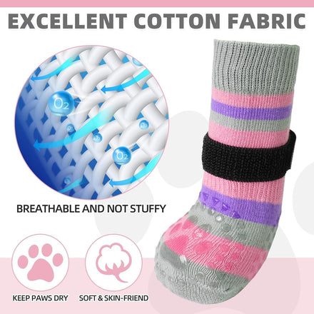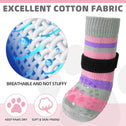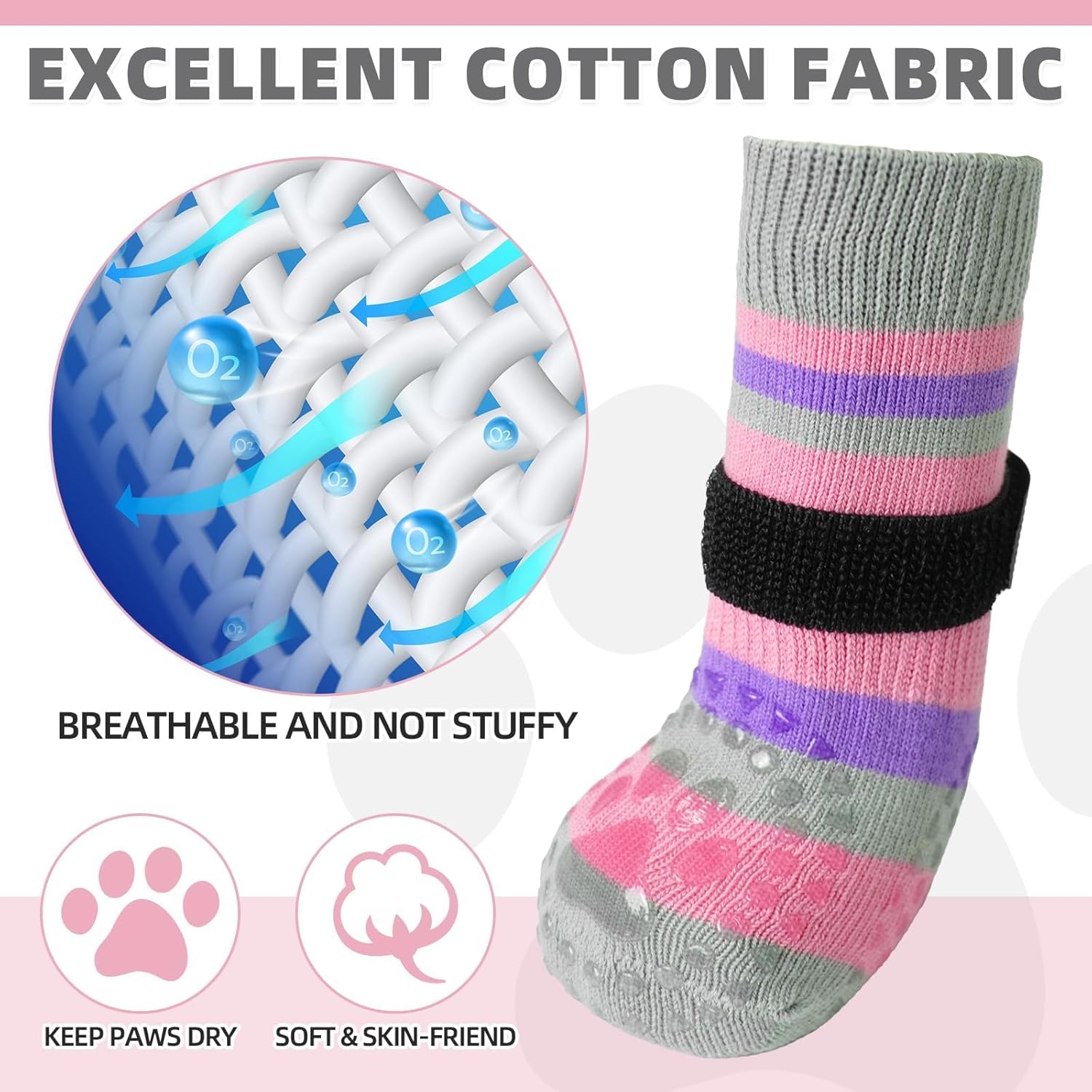 COMFORTABLE TO WEAR: Made of 75% Cotton and 25% Polyester, which provides the perfect stretch for your pet's feet. The soft, breathable fabric can effectively keep warm, and it is also excellent in comfort, allowing the dog to feel a soft wrap. And it also can protect your dog's paws from stones and glass, and cold/hot floor.