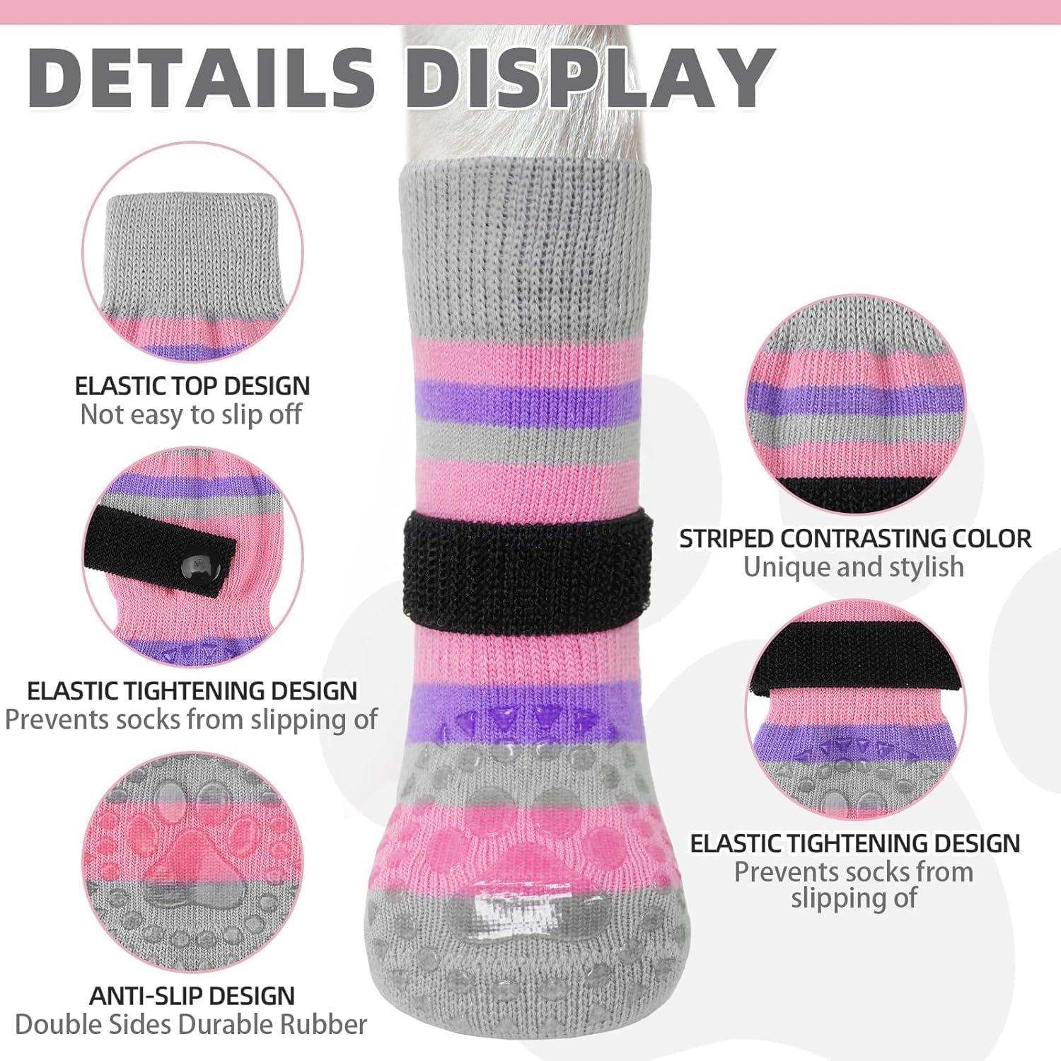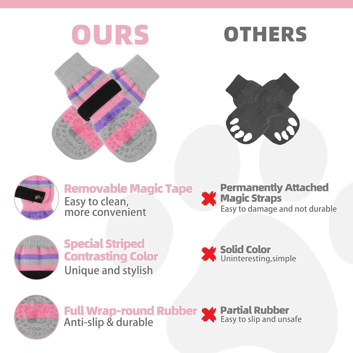 DOUBLE SIDED NON-SLIP: Each side of the sock has the grip, which provides additional traction when your dog walks on a smooth floor. Even if the socks are twisted, they can still work. In addition, the design of the double-sided grip ensures a longer lifespan of the socks. When the grip on one side is worn and has no anti slip effect, it can cause the dog to wear on the other side, exerting a new anti slip effect.