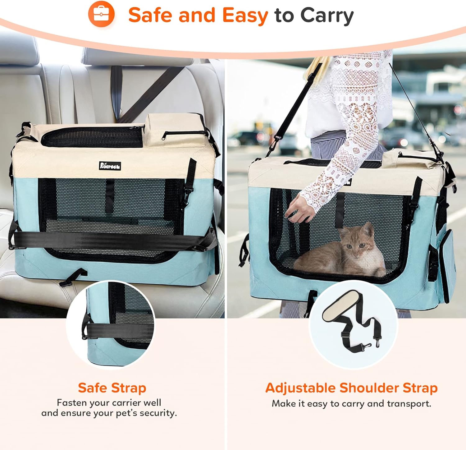 - 🐾【Collapsible & Portable】The soft-sided cat carrier also comes with a lightweight, flexible structure that can easily be compressed under a seat or anywhere. The lightweight pet carrier is also portable with a padded shoulder strap and handles, making it easy to carry and store. Making it the best cat dog carrier for long-distance car travel.