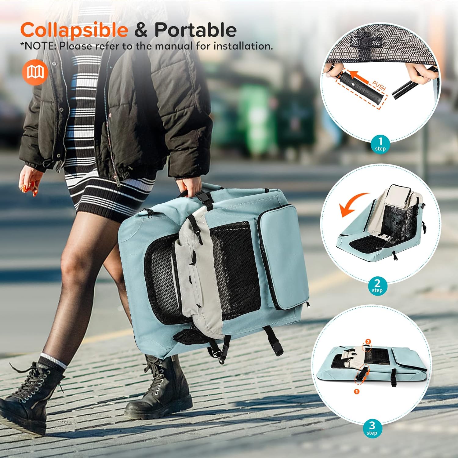 Our collapsible pet carriers are made of heavy-duty metal pipe, which is more sturdy than other plastic ones. Due to the durable structure, our cat carriers could bear more load capacity up to 55 lbs.