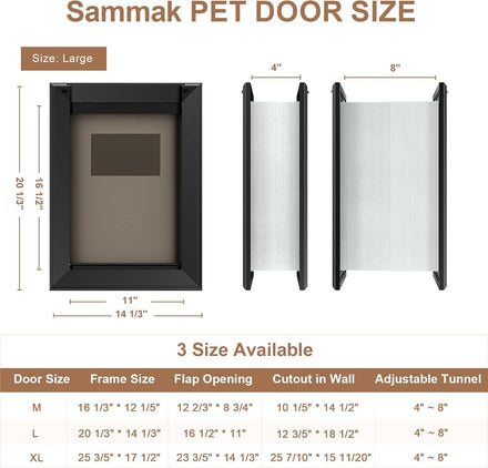 - [Patented Design - Pro 2.0] Dog door with telescoping tunnel can be installed on walls of different thickness of [4"-8"]. Frame:[14 1/3"W * 20 1/3"H]. Flap: [11 1/5"W * 16 1/3"H]. Suitable for pets up to [110 pounds].