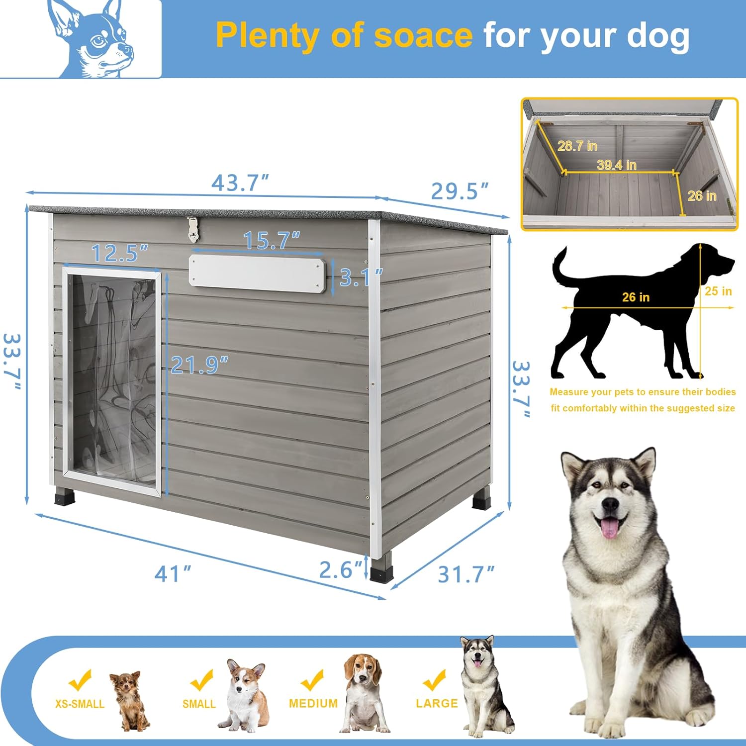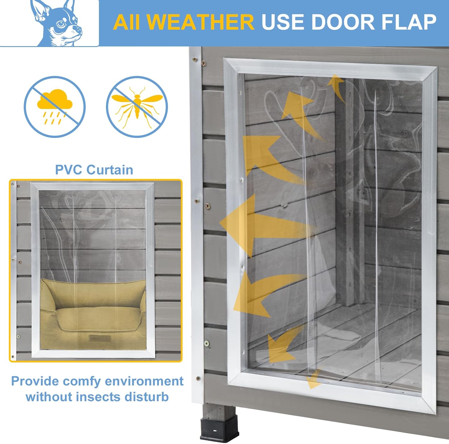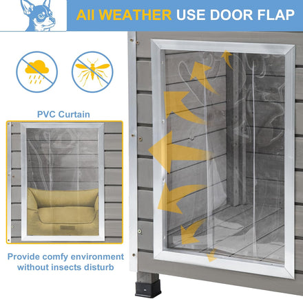 - 🐶🐕【Exquisite Dog House Weatherproof】Write your pet’s name on the doorplate to give them a sense of home. Removable PVC Curtain protects your pet from wind, rain, and natural predators. Easy-to-open slanted asphalt roof protects against wind and water.Facilitates easy feeding and cleaning. This dog house offers a combination of practical and thoughtful design features, ensuring your pet feels at home and stays protected from the elements.