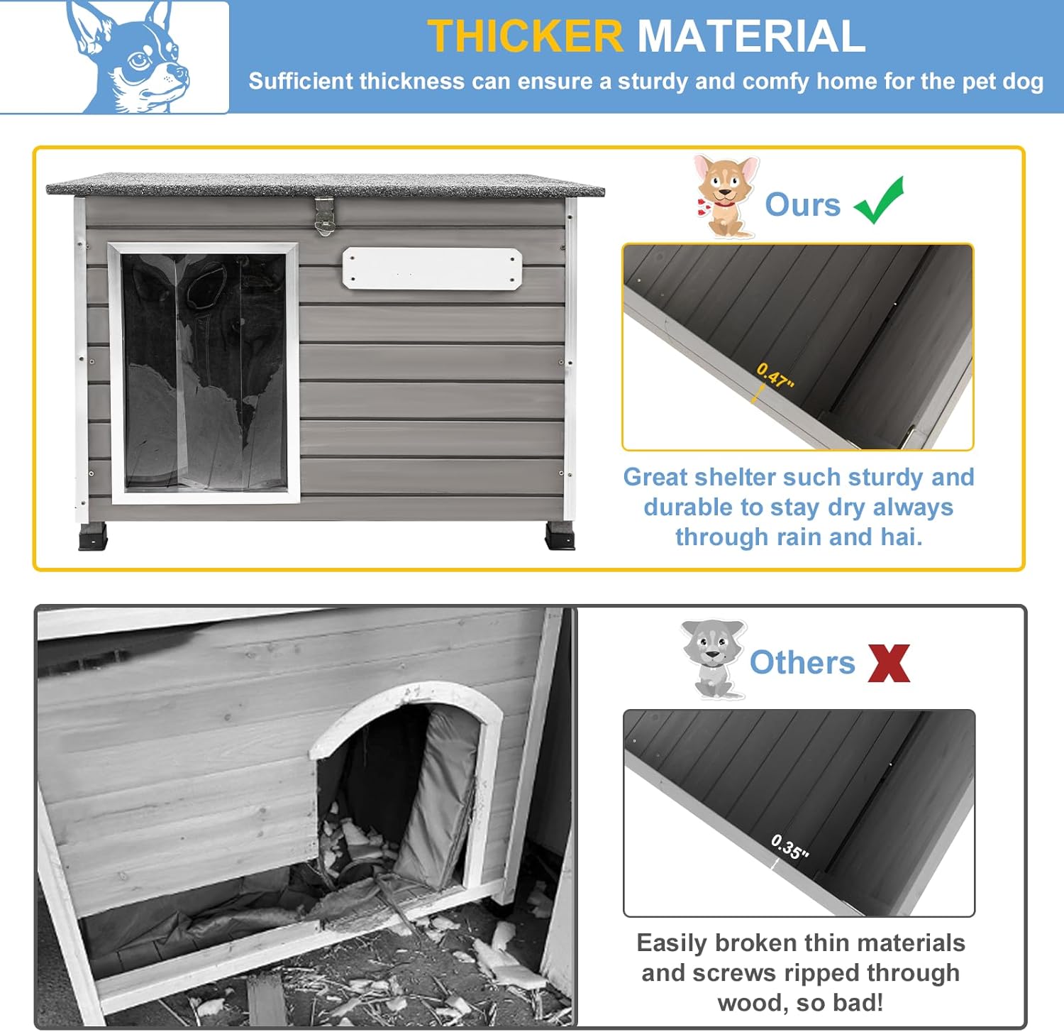 - 🐶🐕【Stable & Durable】The dog house is made of high quality fir wood, which is not easy to deform and crack. It is fixed with multiple types of nails and screws, which can ensure a solid overall frame.The 4 right-angled mental parts can provide the shelter with stronger stability. The metal pole can avoid the dog house from being chewed by pets.