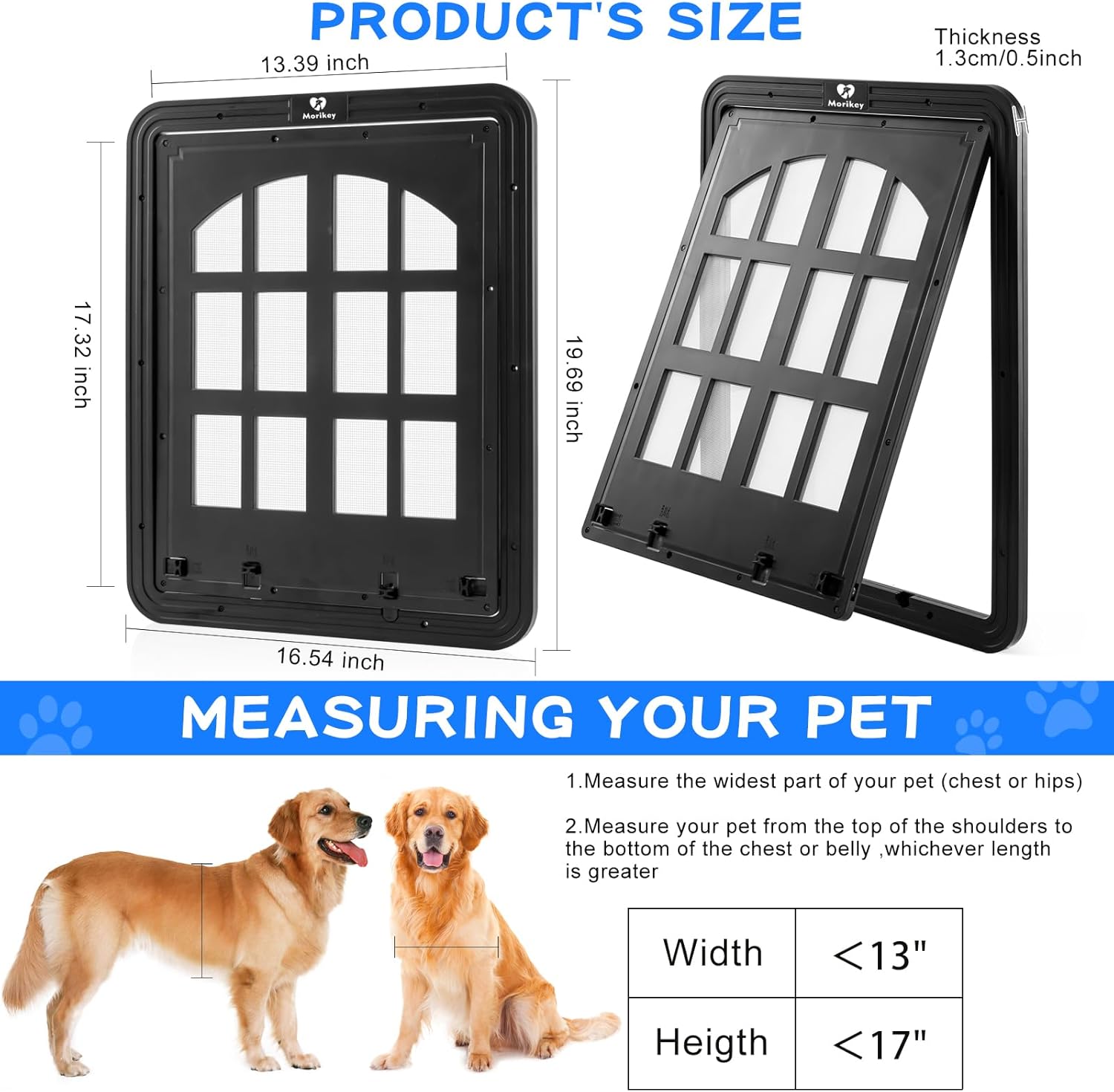 - [Spacious Design] Outer dog screen door frame size is 16.6" H x 19.7" W , the flap opening size is 13.3" W x 17.3" H.The large size provides enough space for large dogs to pass comfortably.Most small to large dogs and cats weighing less than 135 lbs will do well with this pet door!