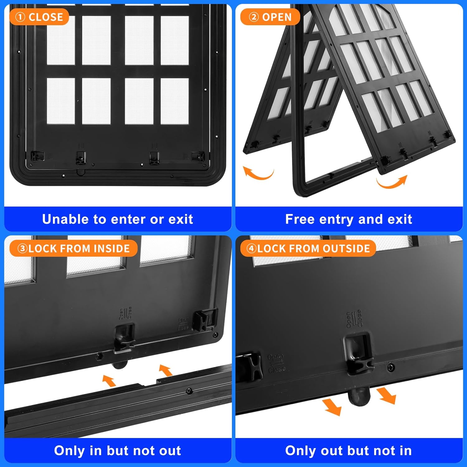 - [4 Entry Ways] According to the door bolts in different directions at the bottom, you can choose 4 ways of entry and exit for this large dog door : fully closed, fully open, only in and out, or only out and not in,is a great entrance and exit for your doggie and cats.