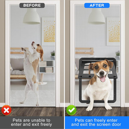 - [Easy Installation] The pet door for screen is quick and easy to install, just follow the instructions using screws and a hobby knife. In addition, we have provided you with installation drawings,you can choose the installation method according to your preference.Although we have included a template card, please do not use it for cutting. Please use the inner page of the dog door for cutting.