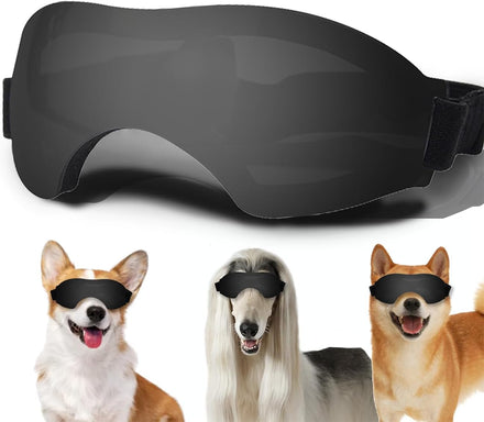 - Product Size: Large dog glasses 5.7 * 2.1 inches, 0.07 pounds. Medium size dog glasses are 5 * 1.8 inches and weigh 0.05 pounds. Small dog glasses 3.94 * 1.4 inches, 0.03 pounds. Dog glasses come with a fixed adjustable band that can be adjusted to suit your dog's needs