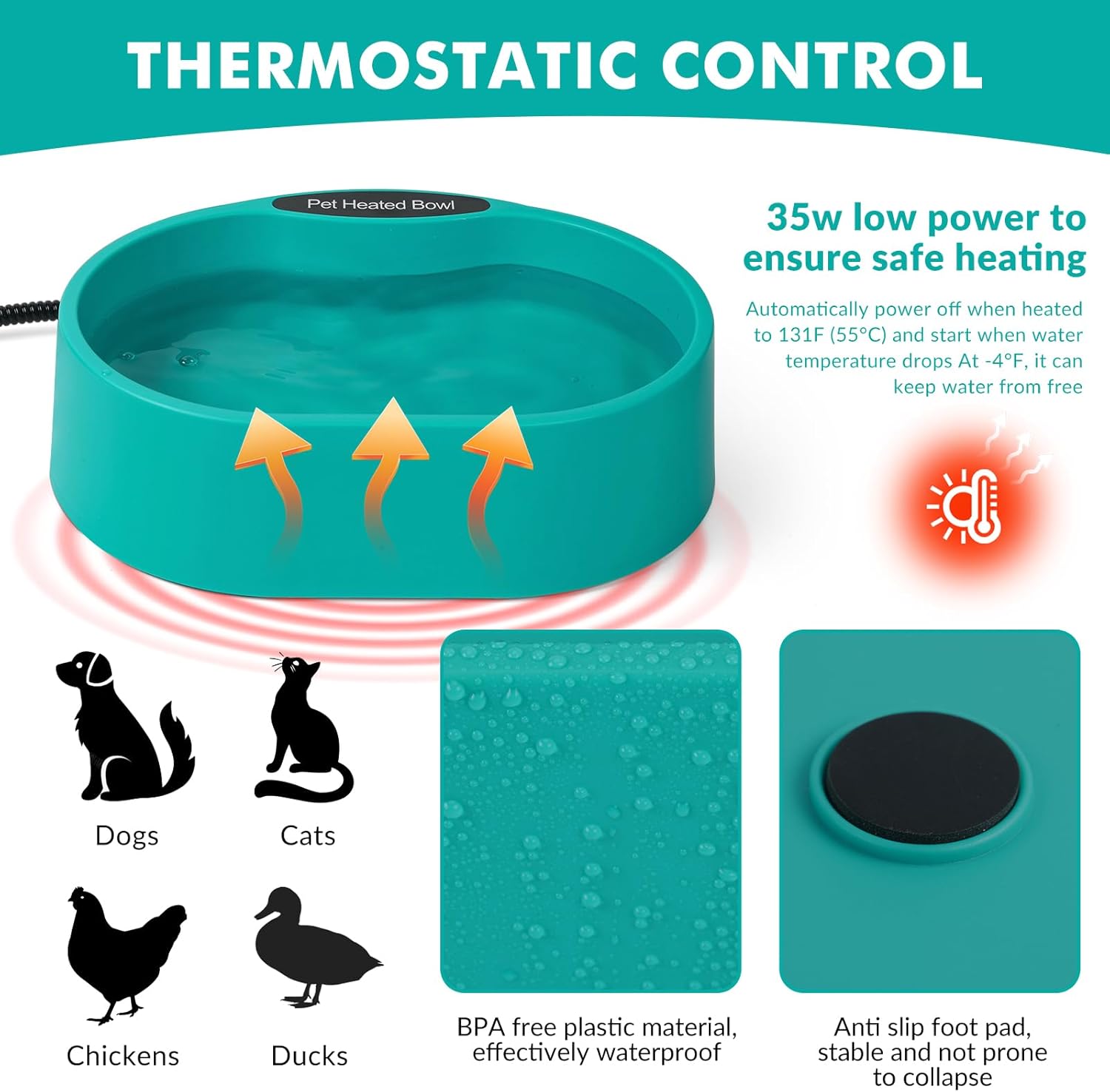 - Safety Product Design: Pet heated water bowl is made of BPA free pp plastic, it is safe for your pets to drink water. With anti-chew cord, you need not worry about the wire is bite by dog. We use the sturdy and safety material to make heated dog bowl, every product has passed strict testing before leaving the factory.