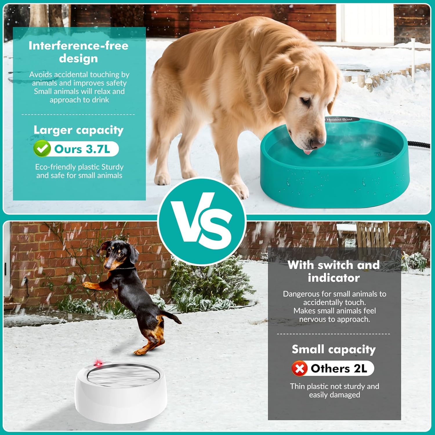 - Suitable for Kinds of Pets: The Anti-freeze heated water bowl can be used outdoor in winter, and available for dog, cat, rabbit, chicken, duck, squirrel to provide drinkable water. We recommend placing it in a sheltered area to avoid wind damage, do not immerse the pet's thermal bowl in water, and unplug when there is no water in the bowl.