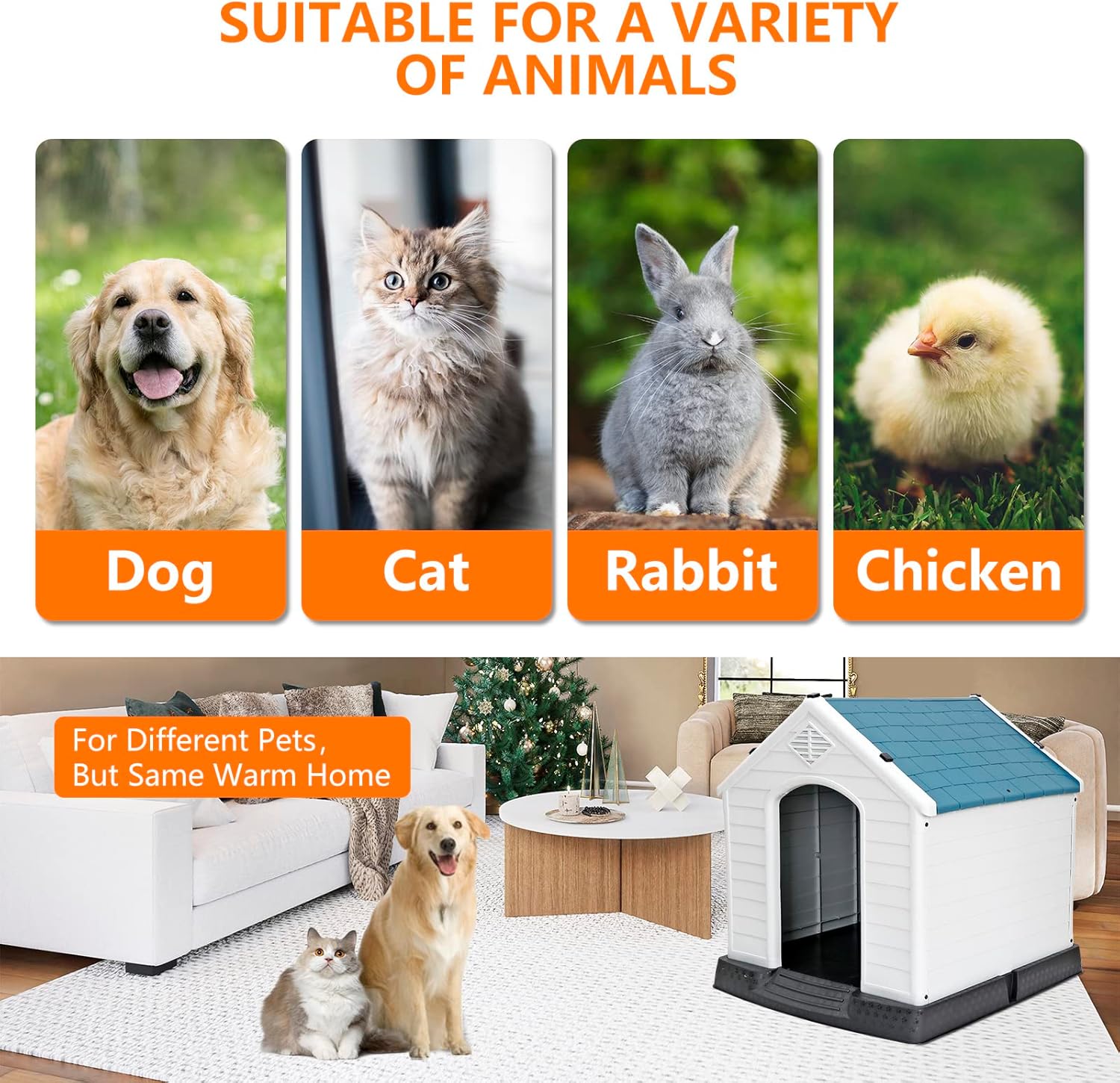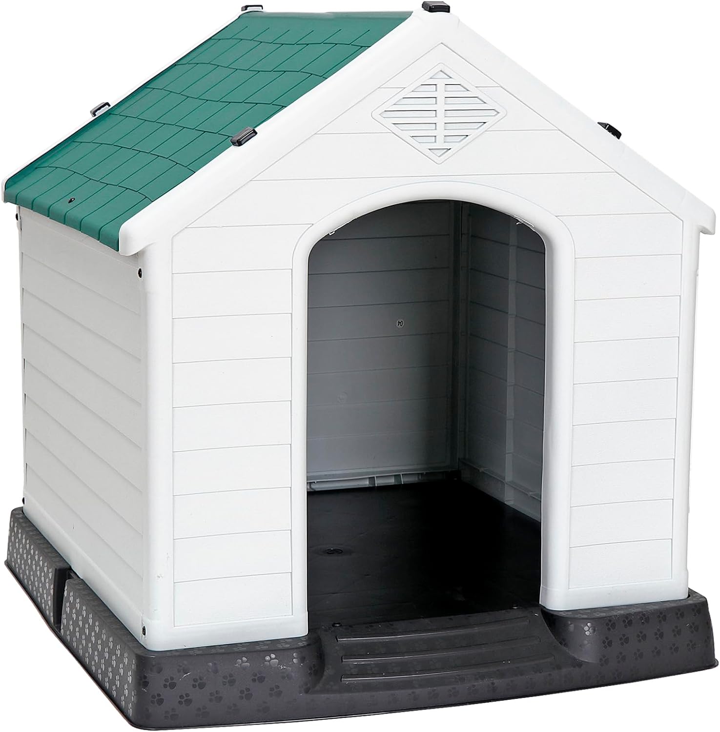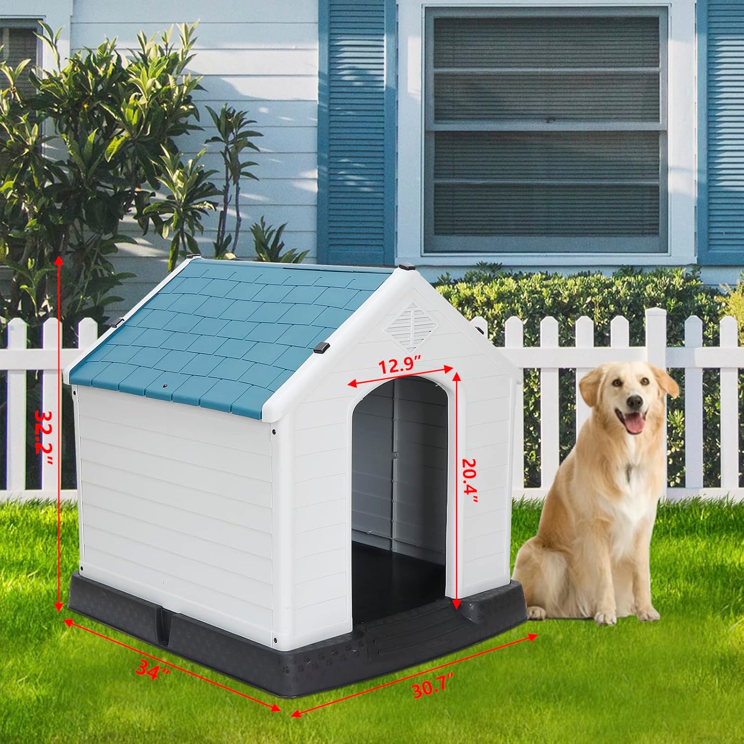 Elevated Base and Large Space: The 3.34" higher floor design can prevent dirty water or rainwater flowing into the plastic dog house, protecting the lovely dog from dirt, rain, snow, providing a strong and warm shelter for your pets. The large dog house measures 30.7L x 34W x 32.2H inches is suitable for different sized dogs and puppies up to 100 pounds. Entrance size is 20.47H x 12.99W inches. The interior space accommodates large and medium dogs.