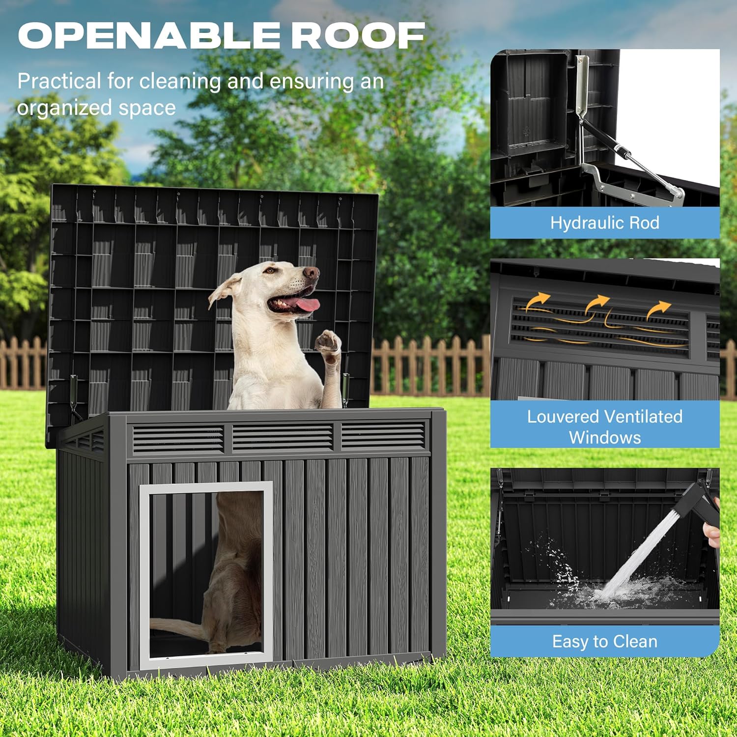 - 🐕【Safe & Durable Construction】: The hinged roof opens smoothly with dual hydraulic gas struts, crafted from high-quality PP (polypropylene) material for secure support and impact resistance. This sturdy mechanism enhances the kennel’s safety and long-term reliability.
