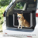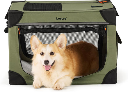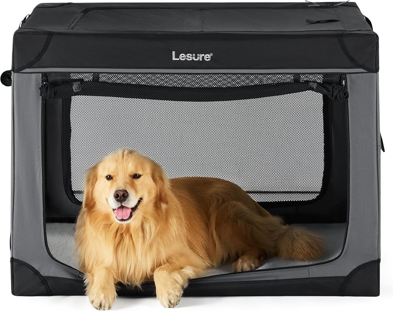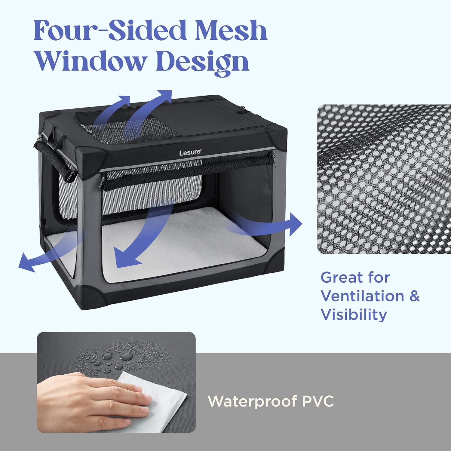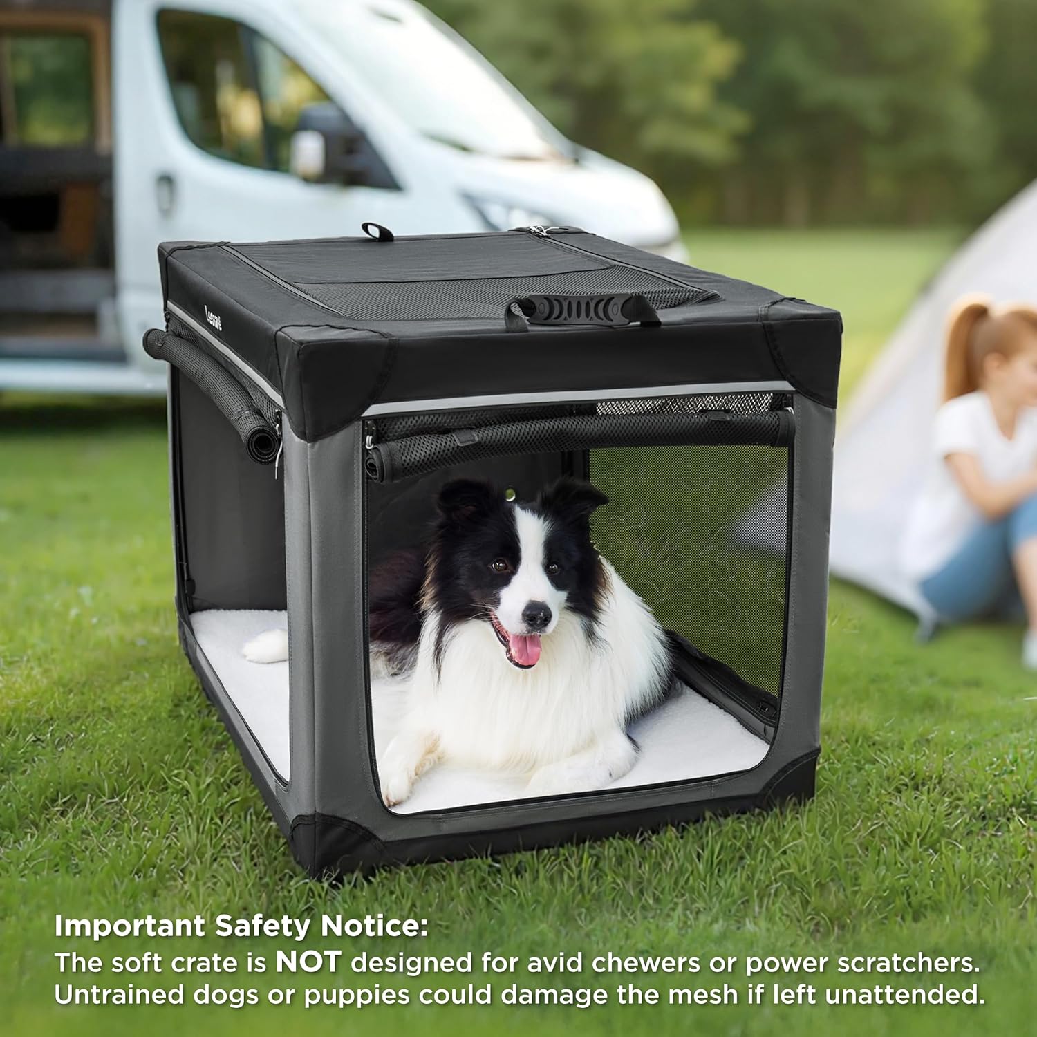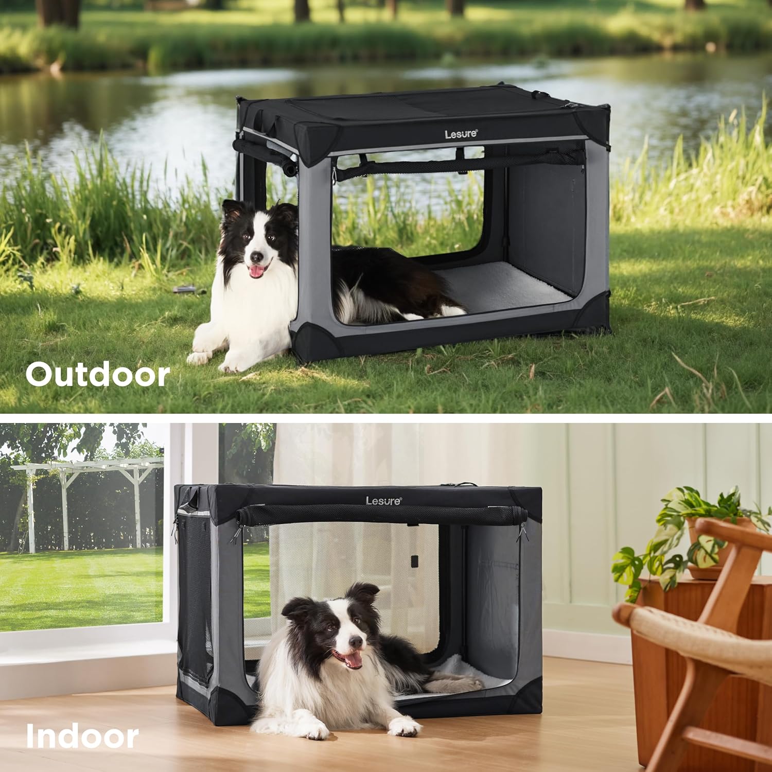 - Enhanced Safety: With a heavy-duty iron frame, this crate maintains its shape and ensures durability. Reflective strips on both sides enhance visibility, keeping your pet safe and visible. The crate is equipped with self-locking zippers, preventing your pet from escaping, while high-density durable mesh adds an extra layer of security. Additionally, an built-in leash further reinforces your pet's safety.