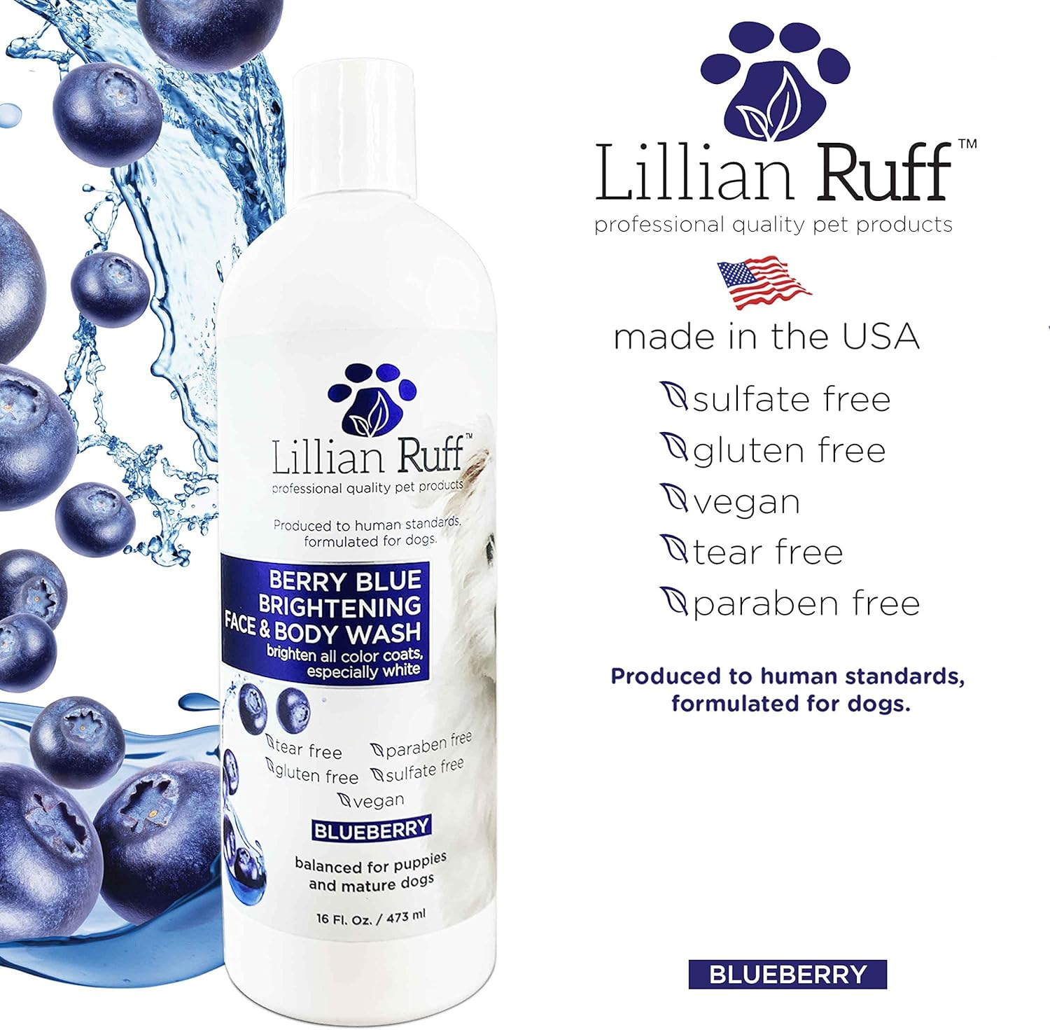 Lillian Ruffs Berry Blue Brightening Face and Body Wash for Dogs and Cats can be used as a facial cleanser, full-body shampoo, and a brightening shampoo. Our specially designed blueberry-infused formula safely and gently removes stain-causing particles from the fur around your dog's eyes while restoring even the whitest coat colors. Crafted with natural essential oils, our berry blue brightening will safely eliminate yellowing, stains & dingy fur to bring out your pet’s natural bright coat.
