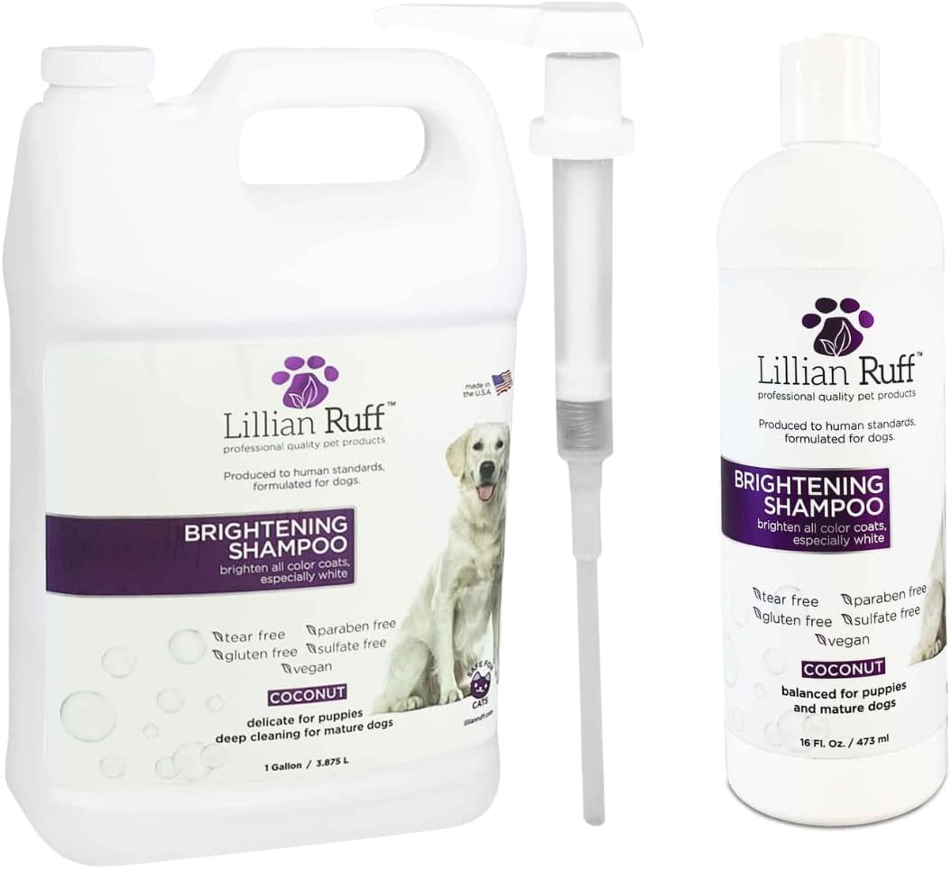 - Unrivaled Brightening Formula: Say goodbye to dull fur with our Brightening pet shampoo. Perfect for short to long coats, its unique formula produces a rich lather that rinses off effortlessly, brightening whites and enhancing coat colors. Unlike other whitening shampoos, Lillian Ruff Brightening Shampoo is suitable for all coat colors, ensuring a vibrant and refreshed look every time.