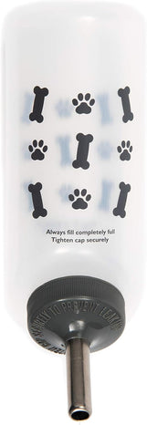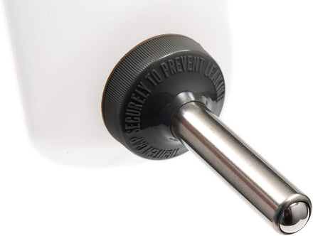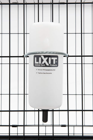 The lixit 30-0685-036 dog water bottle is an opaque, wide-mouth plastic bottle with large ball-point tube cap assembly. Features include: easy installation; 5/8-inch diameter drinking tube; keeps water fresh and clean; premium quality stainless steel tube with double ball; easy to fill and clean; quick-release spring bottle holder. 32-ounce capacity.