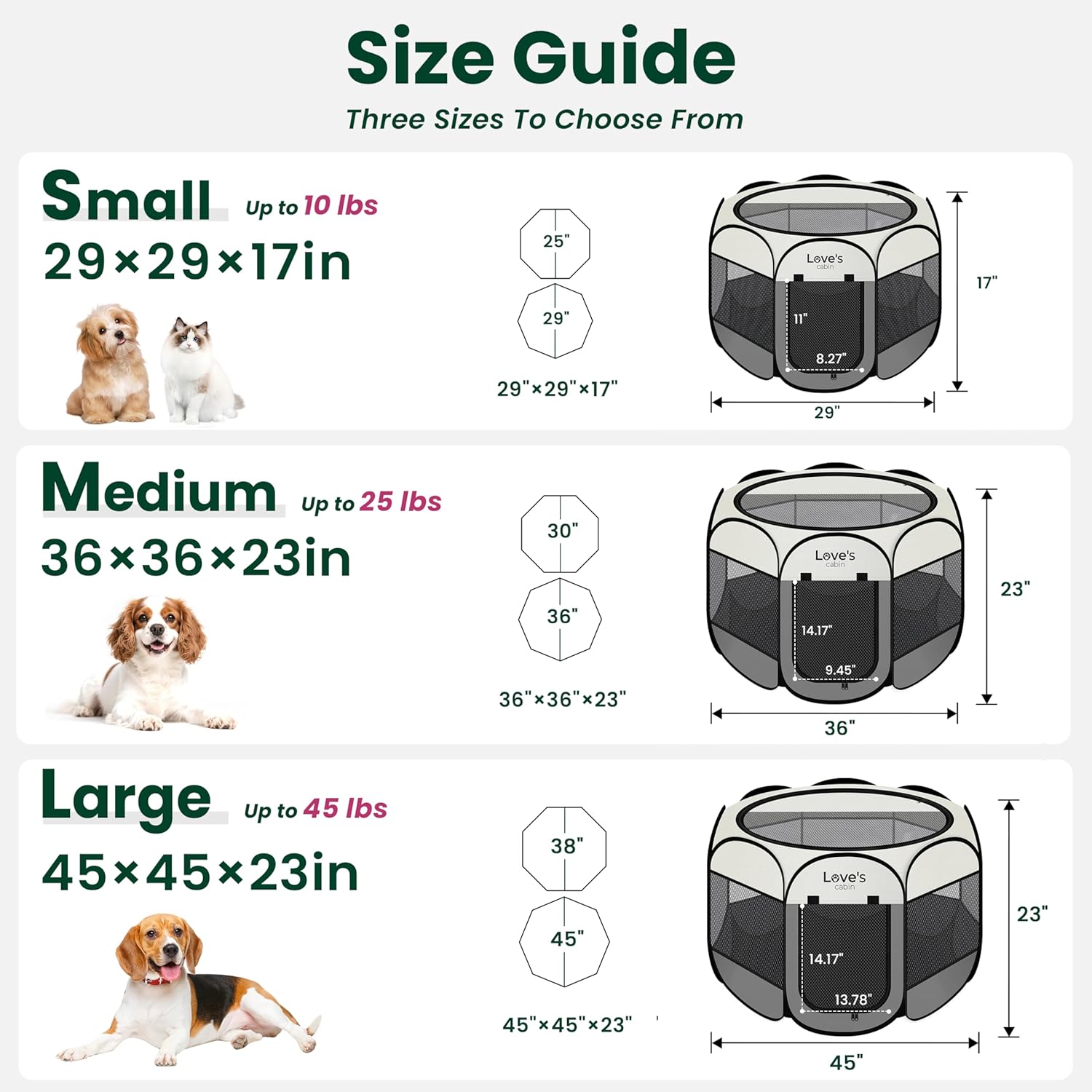 - Multiple Sizes of the Dog Playpen: Gray; Small-29x29x17 inches, suitable for small pets up to 10 lbs; Medium-36x36x23 inches,suitable for pets up to 25 lbs; Large-45x45x23 inches,suitable for pets up to 45 lbs. Please Measure your Pets before purchase. All dimensions are measured manually, please allow deviation of 1 inch.