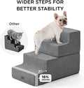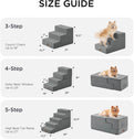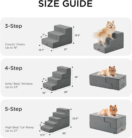 - Multiple Step Options - These pet stairs come in 3, 4, and 5-step versions to fit your needs. The 3-step is ideal for low couches or beds (up to 18"). The 4-step is better suited for medium-height furniture (up to 23"), and the 5-step helps pets easily reach higher beds or cars (up to 27")