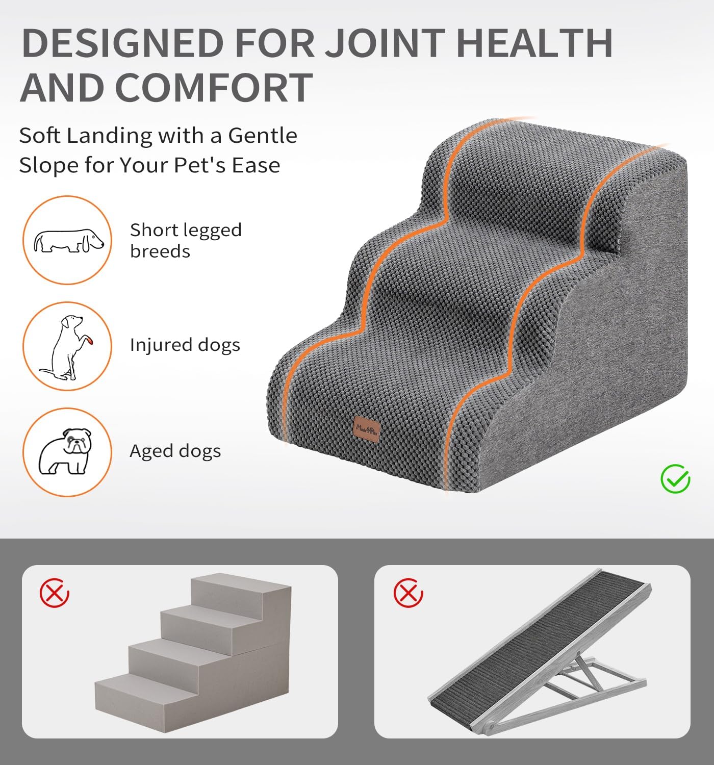 - Diseño de rampa cómodo y amigable con las articulaciones: estas escaleras de espuma para mascotas cuentan con una pendiente suave que reduce la tensión en las articulaciones de tu mascota, por lo que son perfectas para perros con movilidad limitada, problemas de articulaciones o mascotas mayores. La espuma suave y estable ofrece la máxima comodidad mientras tu mascota sube con facilidad.