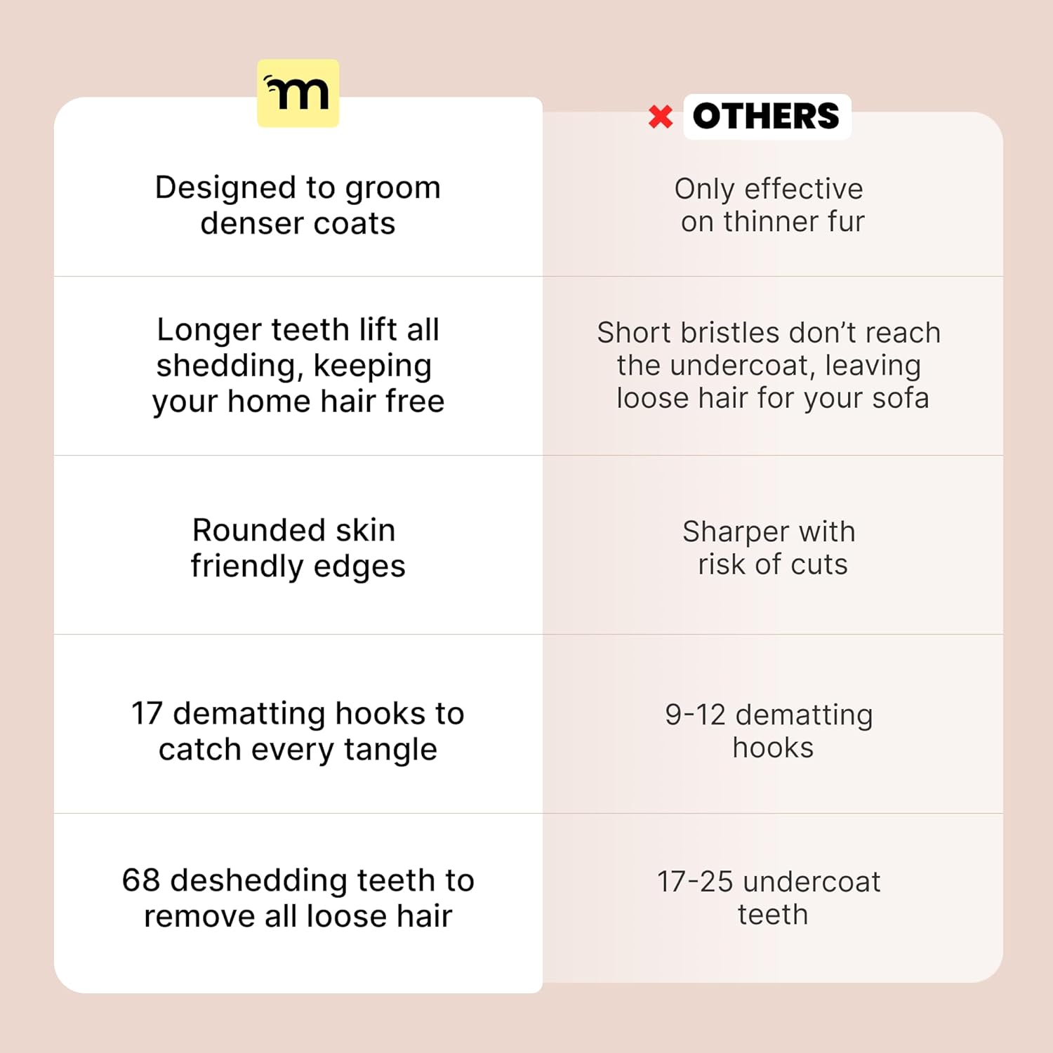 You wouldn't settle for a brush that tugs, so why should your dog? Malsipree's dog brush for shedding is both a de-matting and deshedding brush, designed to gently work through dense double coats. With sharpened inner blades and rounded tips, our pet brush cuts through mats without scratching their skin or tugging at their top coat. Then the deshedding side of our long hair dog brush reaches and lifts deep set shedding.
