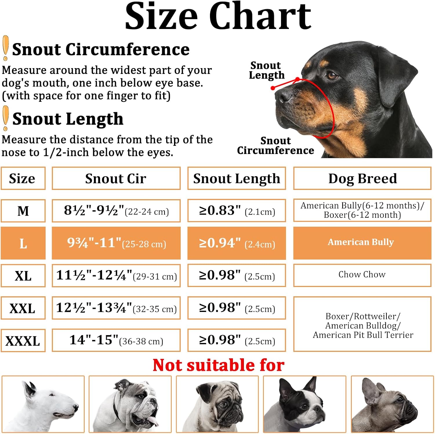 Weight should not be used as the sole guide for size. Please measure your dog's snout circumference and snout length before purchasing. Our dog muzzles have 5 sizes, please refer to the size chart for details.
