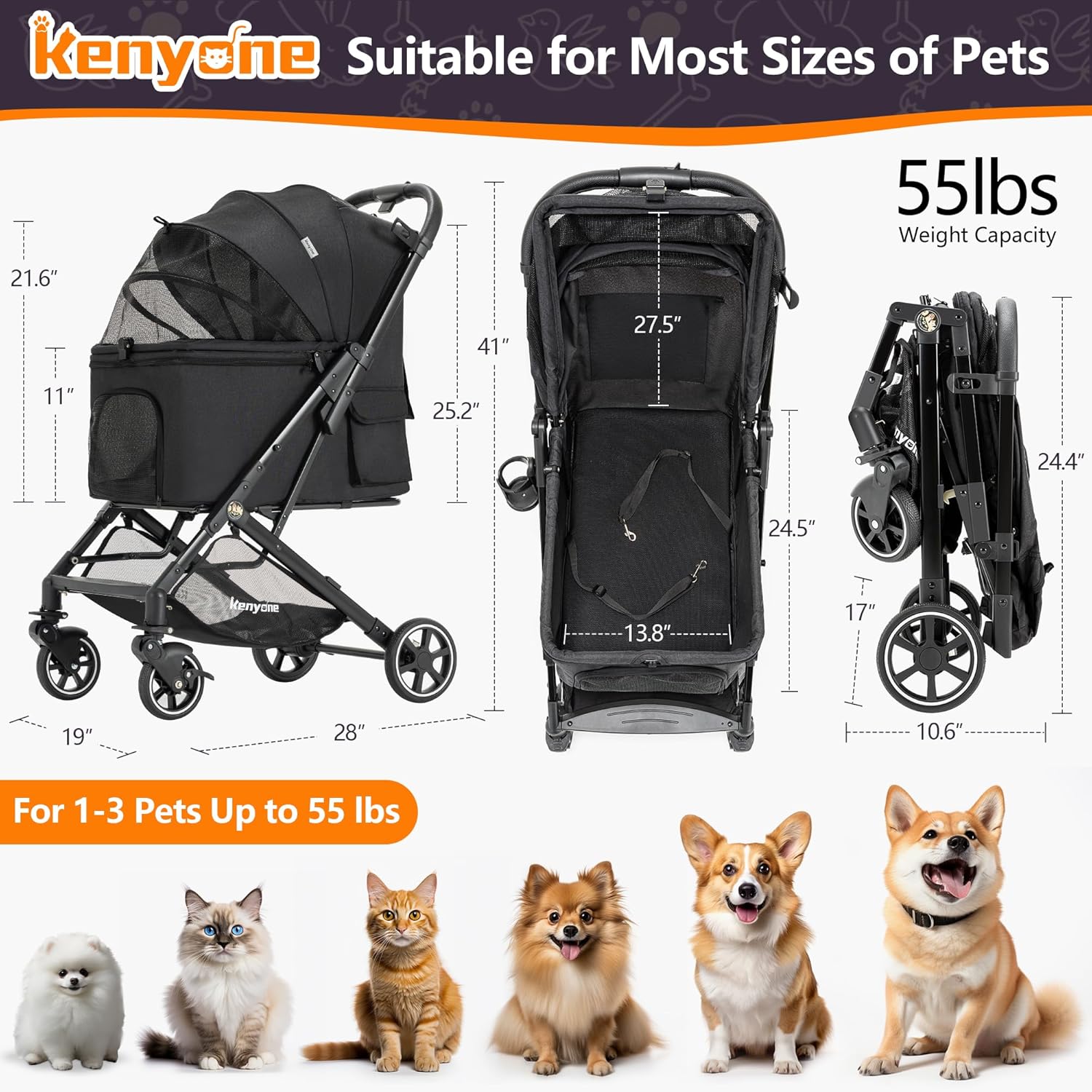 - Designed for Medium Pets: The spacious cloth carrier of the Kenyone stroller measures 24.5" L x 13.8" W x 25.2" H, with an elevated canopy, ideal for medium to large dogs or cats (body length under 24"). It provides enough room to comfortably fit three small puppies under 15 lbs, two 20 lbs medium-sized doggies or a large dog weighing up to 55 lbs.