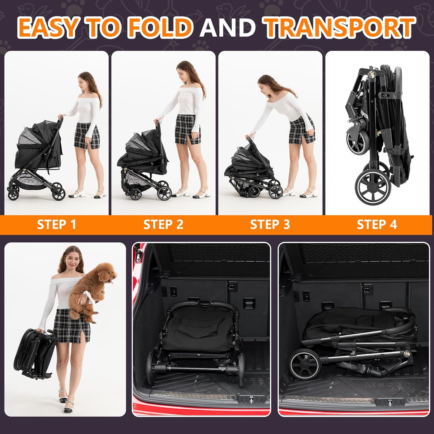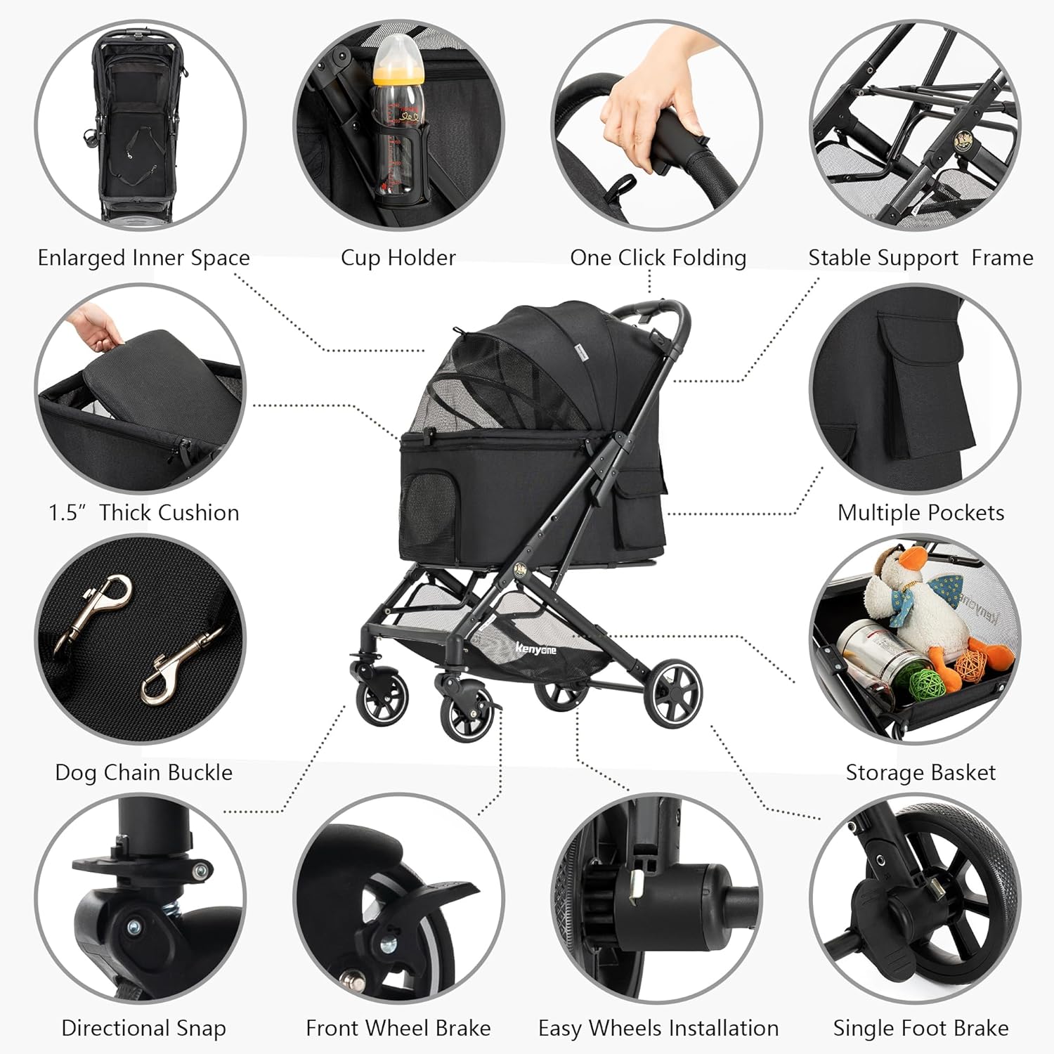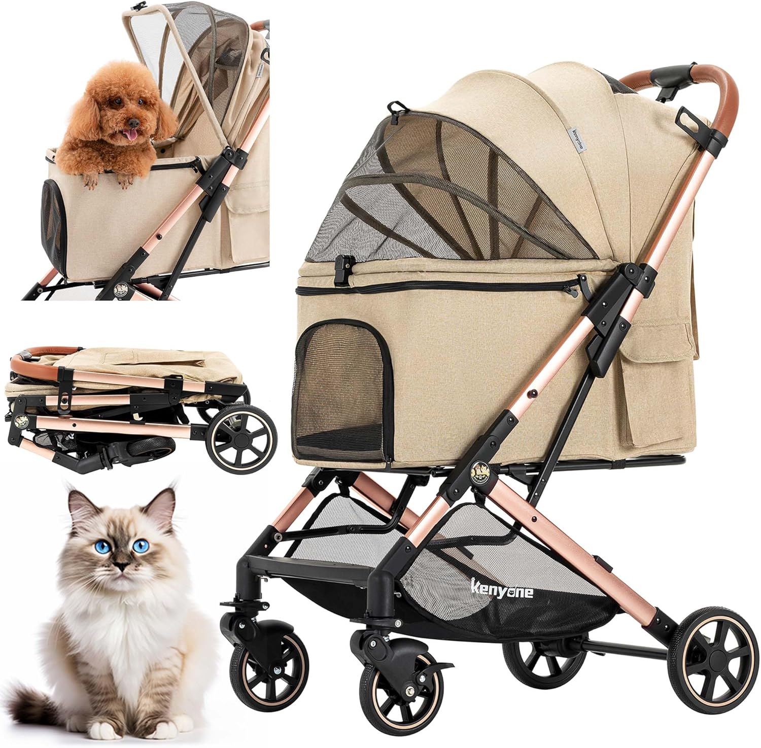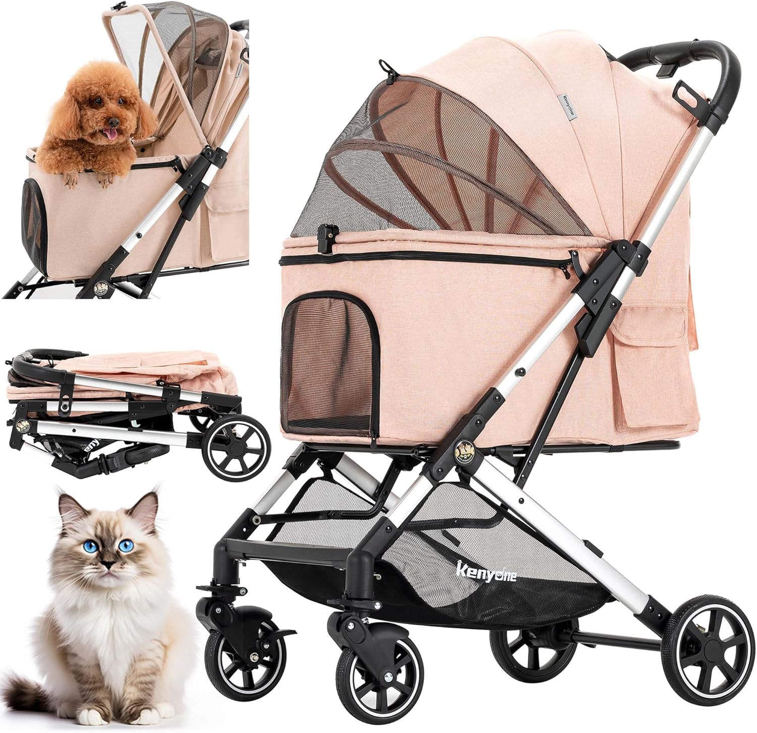 - Lightweight & Easy to Use: Kenyone C310 pet stroller weighs only 13.6 lbs—30% to 40% lighter than strollers of similar capacity, making it much easier to handle and maneuver. The compact one-click folding system allows you to fold the stroller effortlessly with just one hand, and assembly is a breeze—simply attach the four wheels, no complicated steps required. Equipped with fully detachable mesh fabric that is easy to clean and replace, this design helps reduce your long-term maintenance costs.