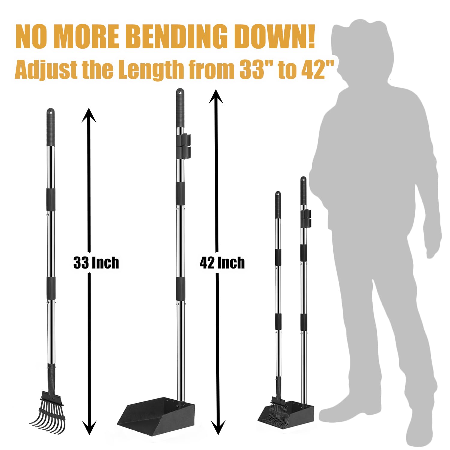 - No Bending Over Pooper Scooper Featuring six stainless steel tubes, you can easily adjust the length from 33" to 42". (Three lengths of tubes can be interchanged on the tray and rake, and you can adjust the length according to your needs.) Its ergonomic design ensures comfort, eliminating back and leg fatigue. The flexible pronged rake glides effortlessly through grass, concrete, and kennels, making pet waste cleanup quicker and simpler. Crafted from rust-proof powder-coated steel, the smooth scoop and rake surfaces rinse clean with ease. Enjoy a stress-free cleanup experience today!