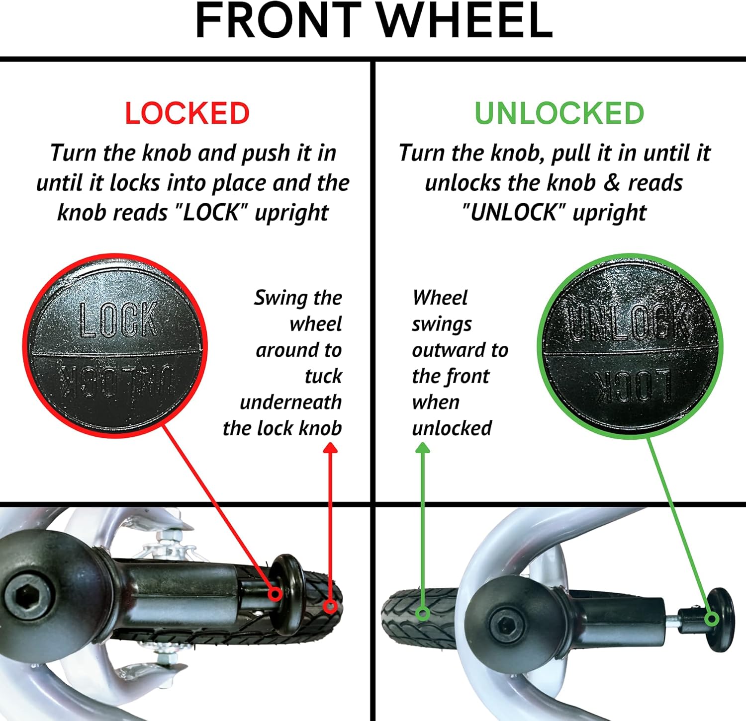 To lock/unlock the stroller's front wheel, a pin needs to be pulled with an easy twist of your fingers.