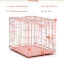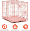 The "all inclusive" Pink iCrate, folding metal dog crate by MidWest Homes for Pets includes all of the features you will need to provide a convenient, safe & secure pet home for your best friend. This metal dog crate includes a free divider panel allowing you to adjust the size of the dog crate while your dog is still growing, a plastic leak-proof pan for easy clean-up in the event of an accident, a strong plastic carrying handle for easy portability & rubber "roller" feet on the bottom of the crate to protect your floors inside the home. MidWest iCrates also feature our patented side clips which reinforce the dog crate & reduce possible sharp points ensuring a safe experience for you and your pet. Every iCrate metal dog crate folds down flat for convenient storage. The 24" iCrate (model 1524) measures 24L x 18W x 19H inches & is suitable for "small" dog breeds. **Please note the term "small" is subjective. For the best fit, we advise that you check the measurements of the actual dog crate against your dog's adult weight & measurements. Your dog should be able to comfortably sit upright, lay down & easily turn-around inside the dog crate. When in doubt we suggest you purchase the larger crate option. We at MidWest Homes for Pets understand that your dog is a part of your family & that's why we ensure our dog crates are manufactured with the highest quality control standards creating a safe home for your pet that you can feel confident with. MidWest Homes for Pets stands behind the quality of our products with our "MidWest Quality Guarantee" 1-Year Manufacturer's Warranty. If you have any questions about our dog crates our customer service department would be glad to help you. MidWest customer service can be contacted at: 1-800-428-8560, available 9:00 AM - 4:00 PM, Monday - Friday.