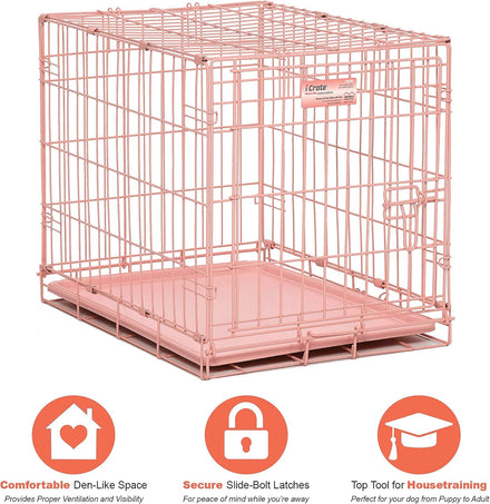 - Pink small single door folding dof crate ideal for dog breeds w/ adult weight of 13 - 25 pounds, Convenient divider panel allows crate to expand as your dog grows, iCrate measures 24 L x 18 W x 19 H inches