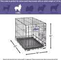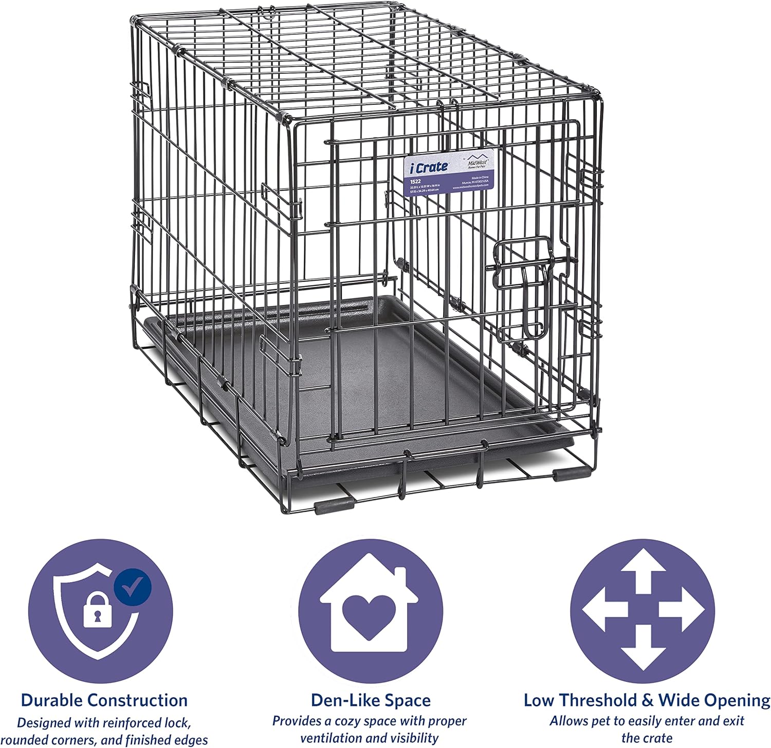 - ICrate single door dog crate measures 22.5L x 13.5W x 16H inches and is suitable for XS dog breeds with an adult weight up to 12 pounds. If your dog’s weight or measurements are on the higher side for this crate, we recommend buying the next crate size up