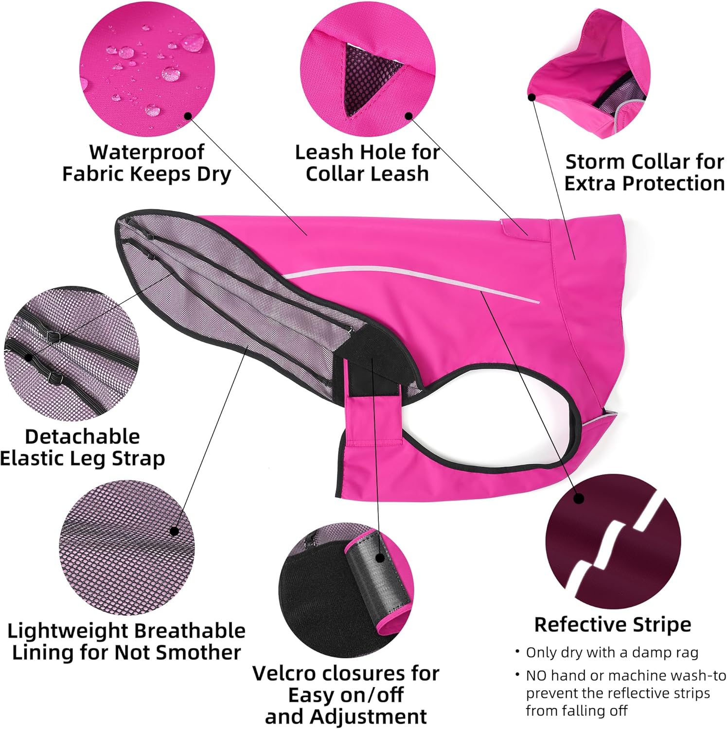 【Adjustable Velcro and Dog Hole】 With easy closures to adjust and snap the raincoat on/off, adjustable velcro closures for a secure and comfortable fit on most breeds of dogs. Hidden dog hole on the back for collar leash connection