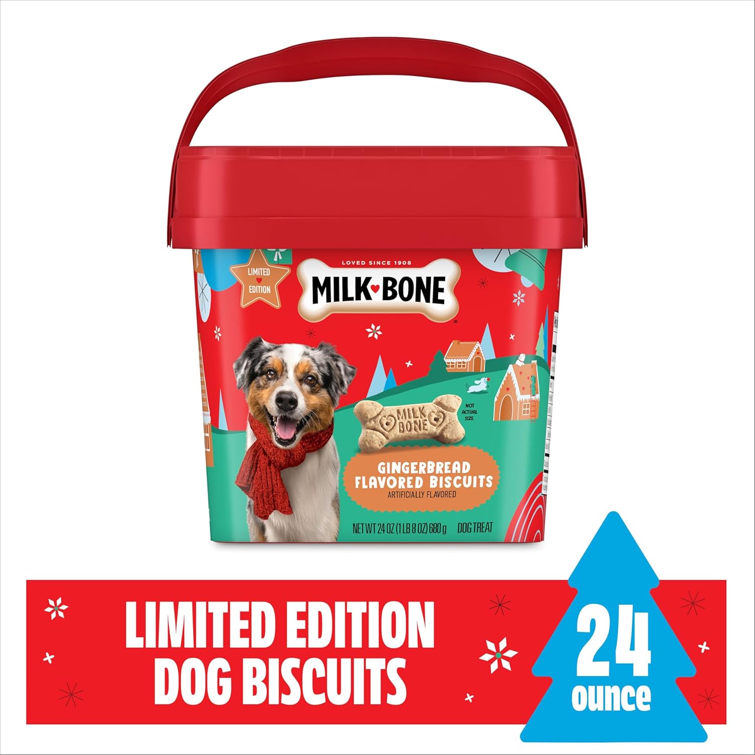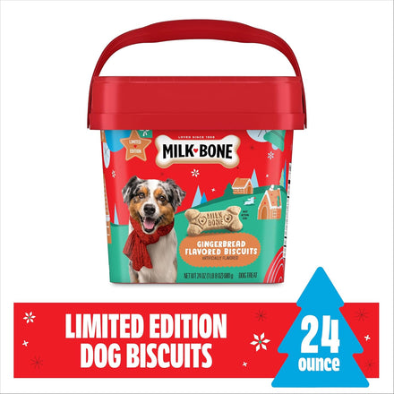 • Contains (1) 24 Ounce Pail of Limited Edition Milk-Bone Gingerbread Artificially Flavored Biscuits