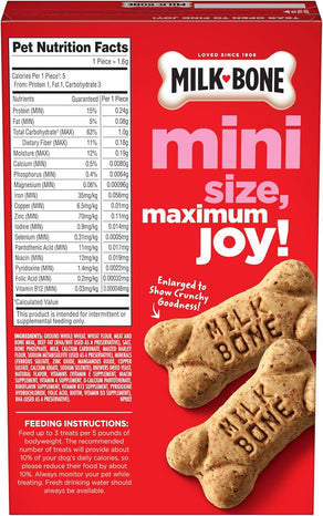 Make your dog′s life more fun with delicious dog snacks from a brand you can trust. Milk-Bone Original mini dog biscuits are prepared with care and will give your dog the simple, genuine joy that your dog gives you every day. How? A classic crunch with a wag-worthy taste — now with even MORE meaty taste compared to the Milk-Bone Original biscuits you know and love. And at only 5 calories per treat with 12 vitamins and minerals, these wholesome, mini dog treats are right-sized for treating more often. Better yet the crunchy texture of Milk-Bone dog biscuits helps freshen dogs′ breath and reduce tartar build-up, a must if you′re into sloppy doggie kisses. So you′ll be almost as happy to give these treats as your dog is to get them … almost.