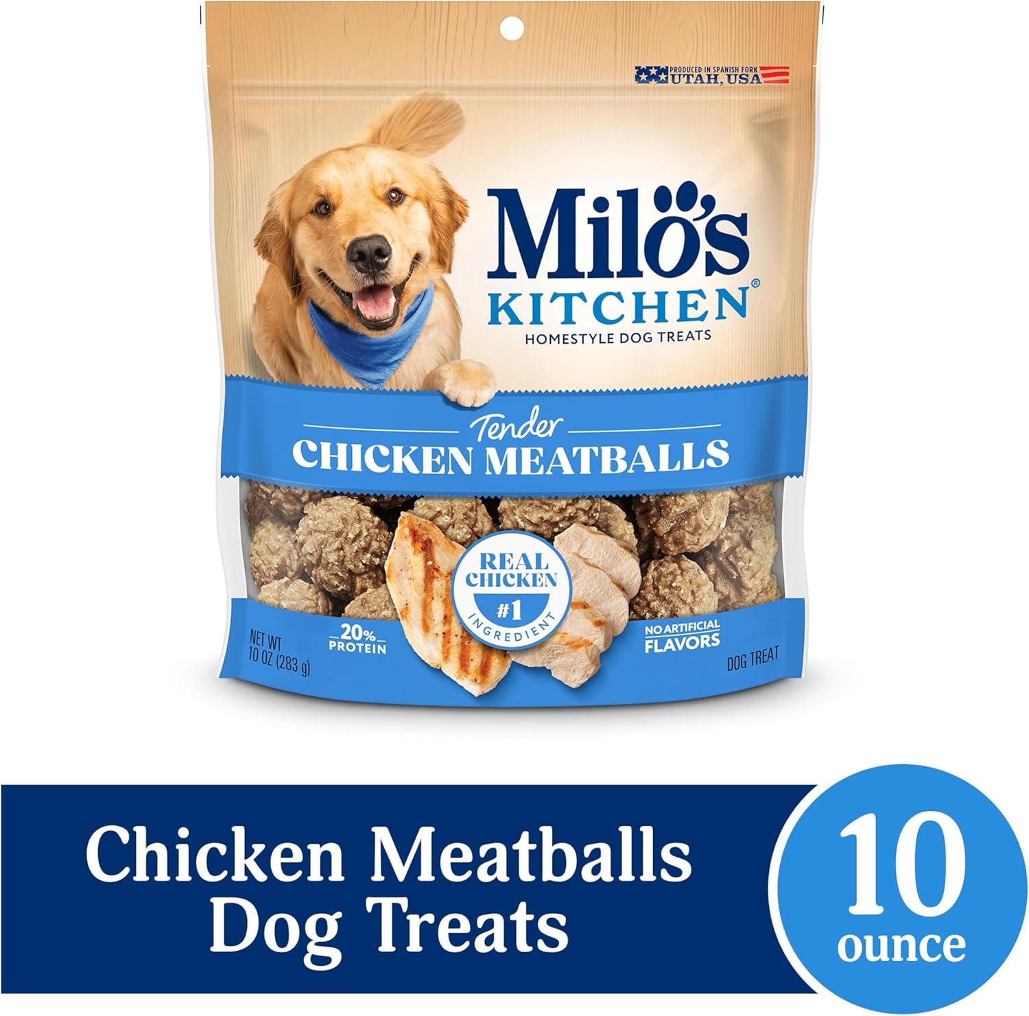 - Contains one (1) 10-oz. bag of Milo’s Kitchen Chicken Meatballs dog treats