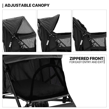 - Adjustable Comfort - Enjoy a customizable and accessible pet strolling experience with our stroller's adjustable canopy, breathable mesh windows, and a cozy padded interior for comfort, complemented by convenient dual-access zippered fronts for easy entry and exit.